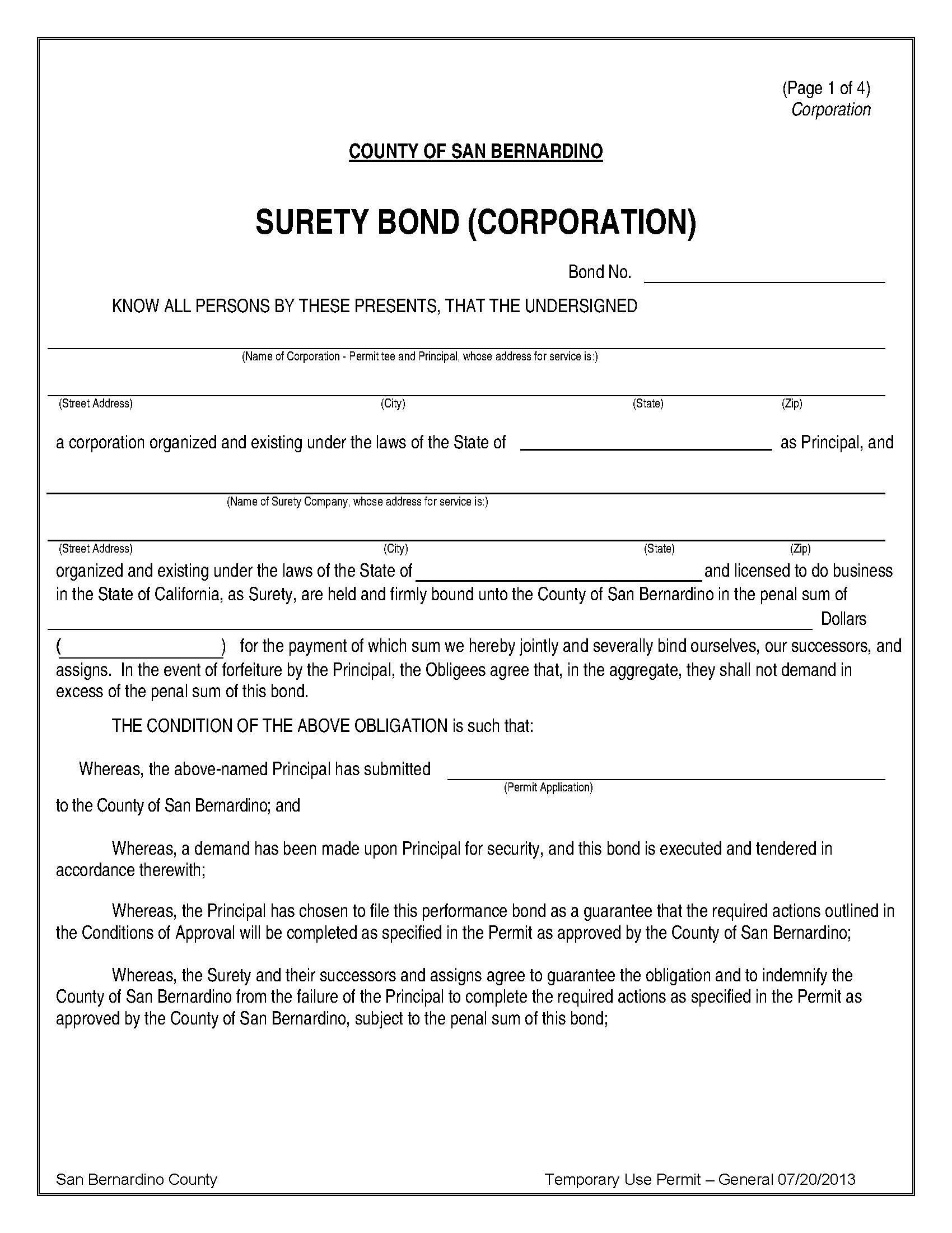 The California County of San Bernardino County of San Bernardino- Temporary Use Permit Bond starts at $100 plus shipping costs and fees. Fill out the form to buy your bond instantly!