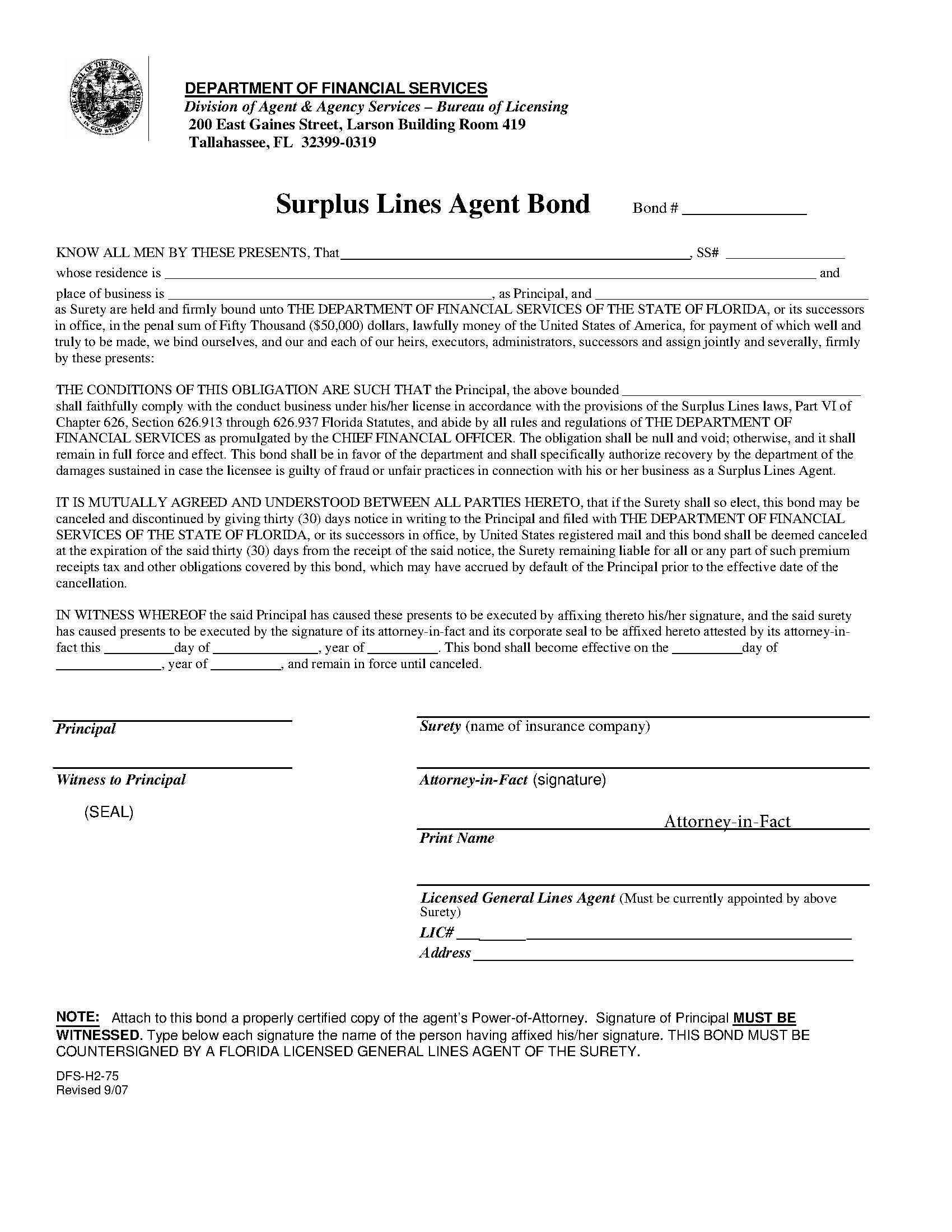 The Florida Surplus Lines Agent Bond starts at $500 plus shipping costs and fees. Fill out the form to buy your bond instantly!