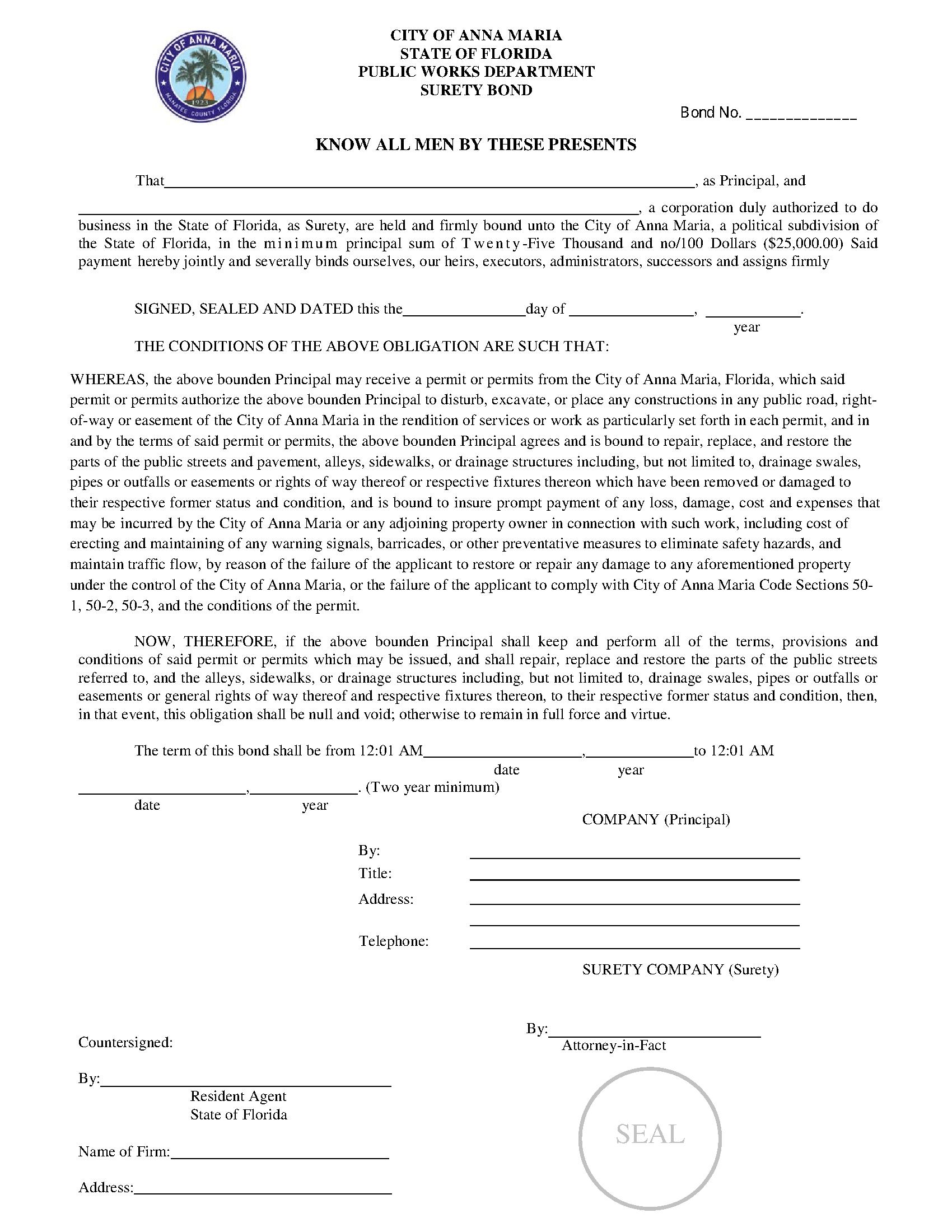 The Florida City Of Anna Maria Department Of Public Works Anna Maria - City Right of Way Bond starts at $250 plus shipping costs and fees. Fill out the form to buy your bond instantly!