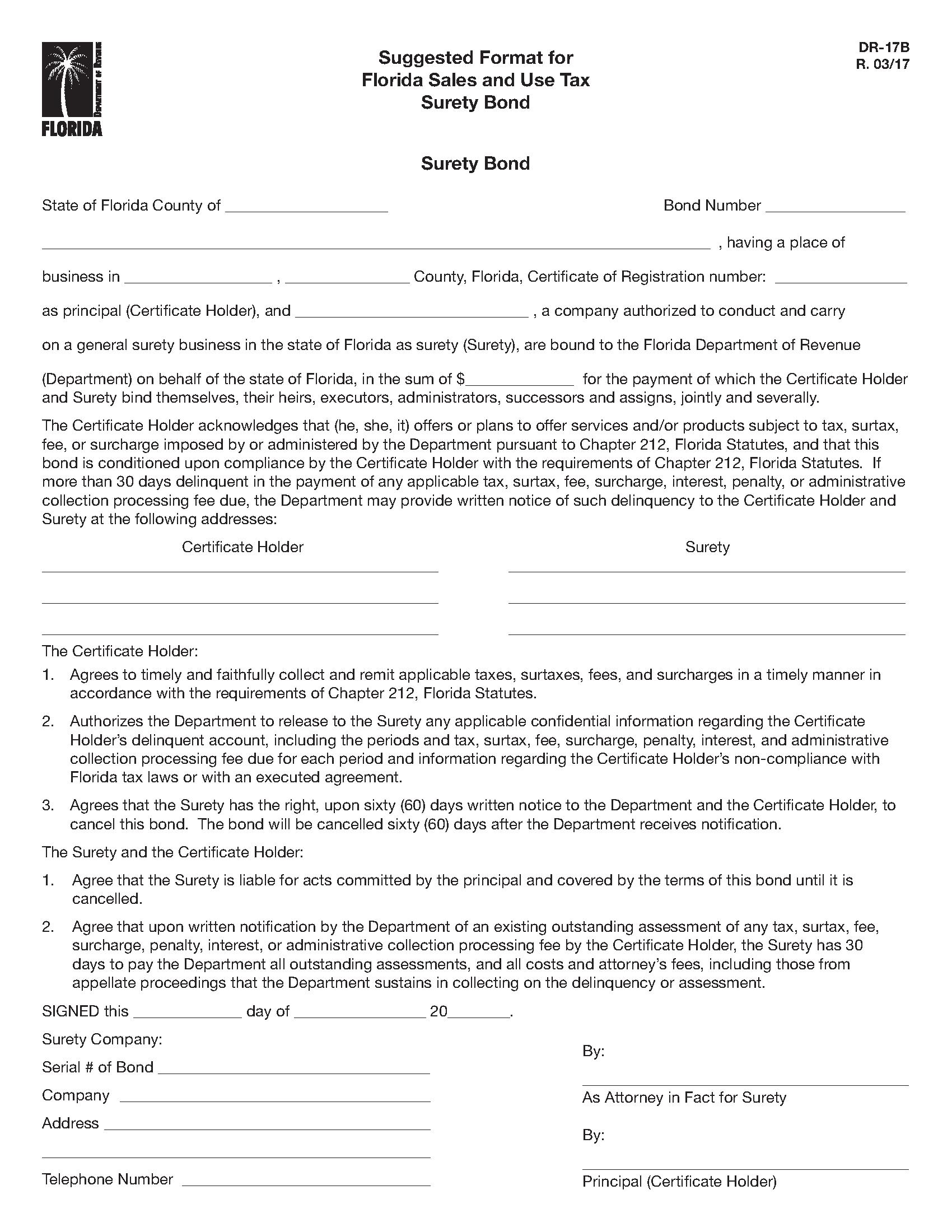 The Florida Contractor's Sales or Use Tax Bond starts at $100 plus shipping costs and fees. Fill out the form to buy your bond instantly!