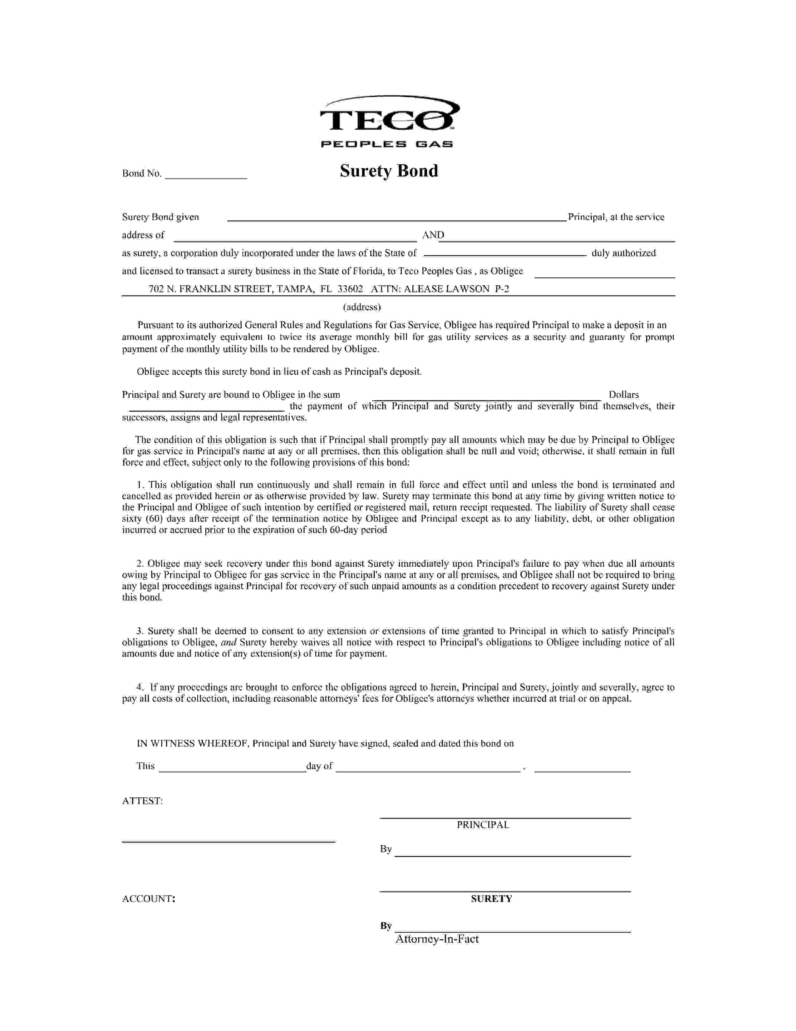 The Teco Peoples Gas TECO Peoples Gas System Inc Utility Deposit Bond starts at $100 plus shipping costs and fees. Fill out the form to buy your bond instantly!