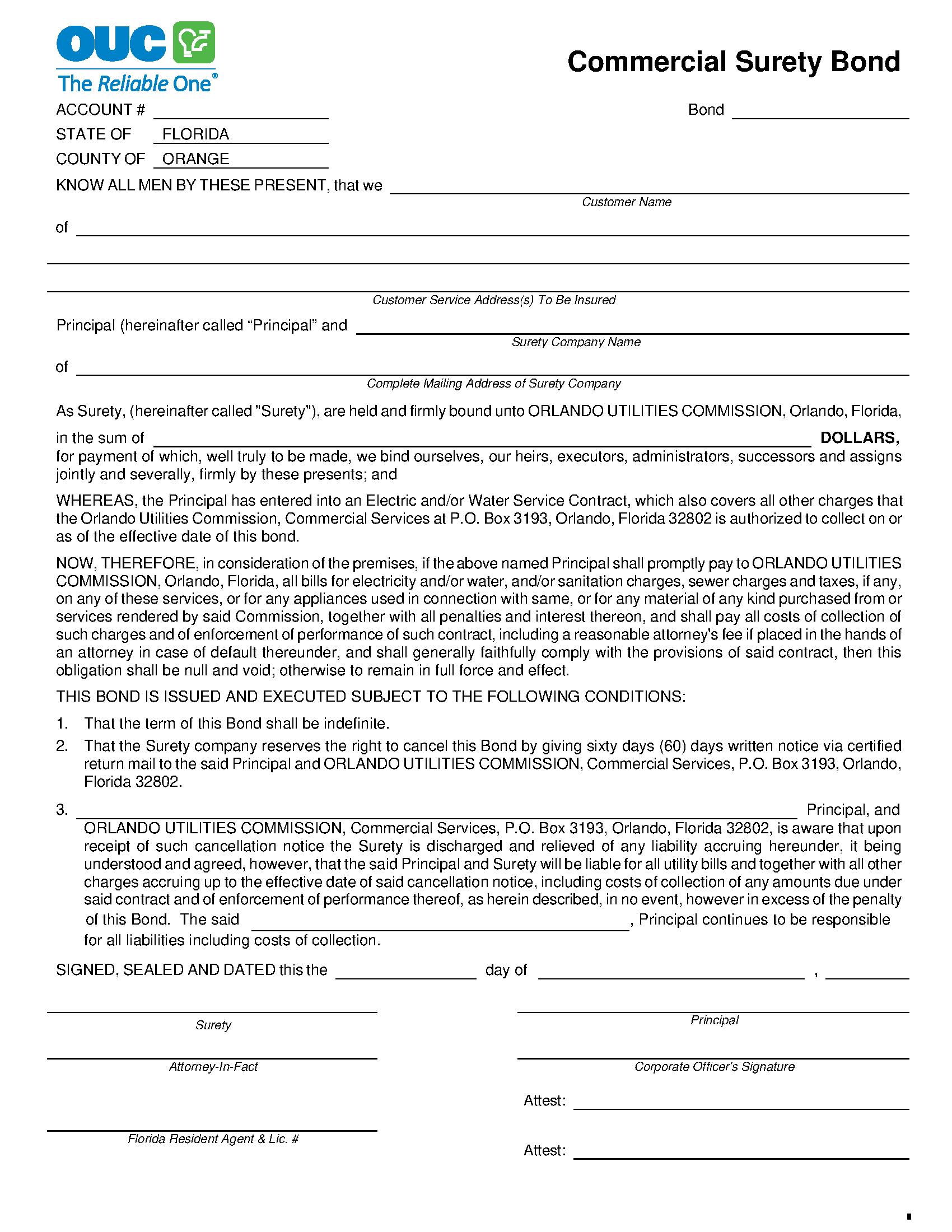 The Florida Orlando Utilities Commission Utility Deposit Bond starts at $100 plus shipping costs and fees. Fill out the form to buy your bond instantly!