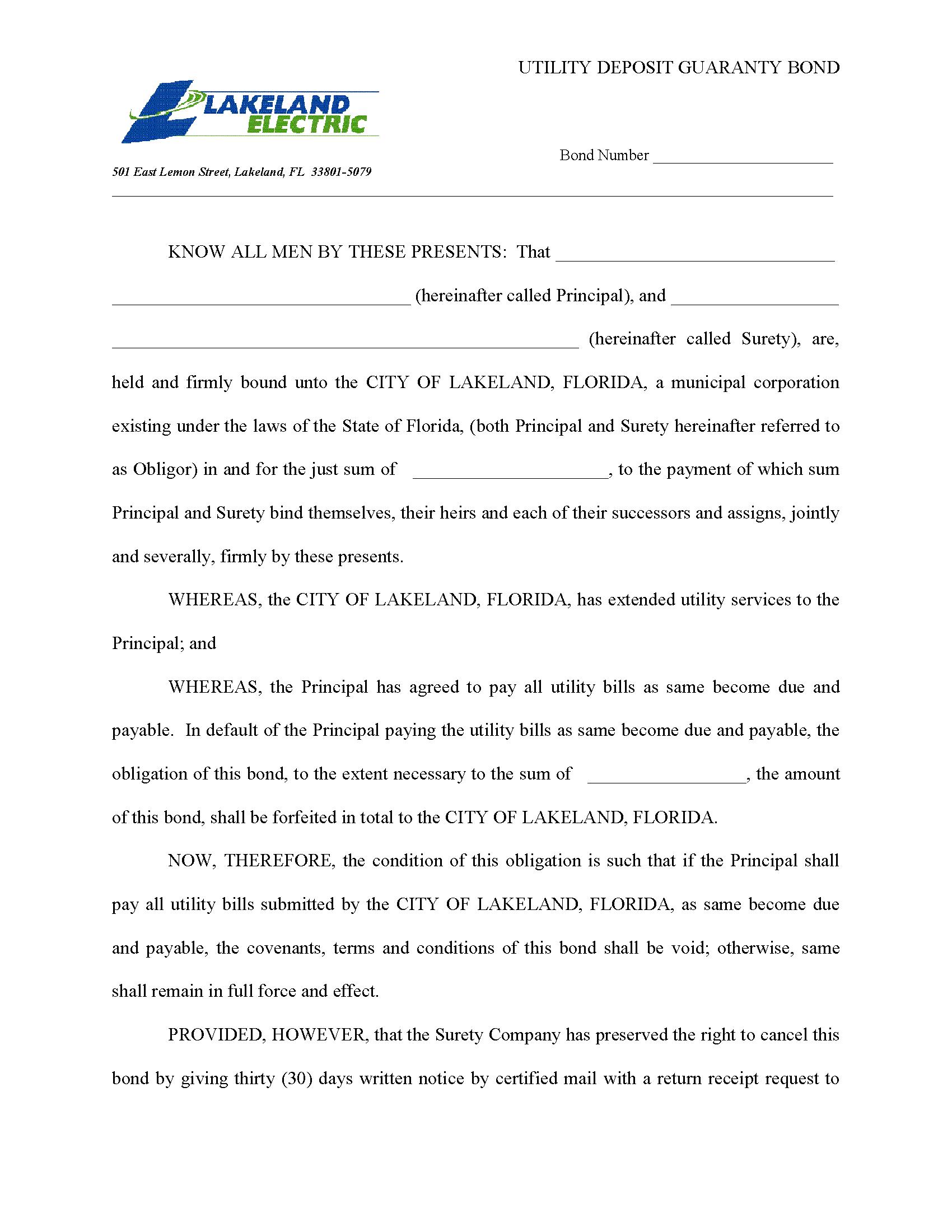 The Florida City Of Lakeland Utility Deposit Bond starts at $100 plus shipping costs and fees. Fill out the form to buy your bond instantly!