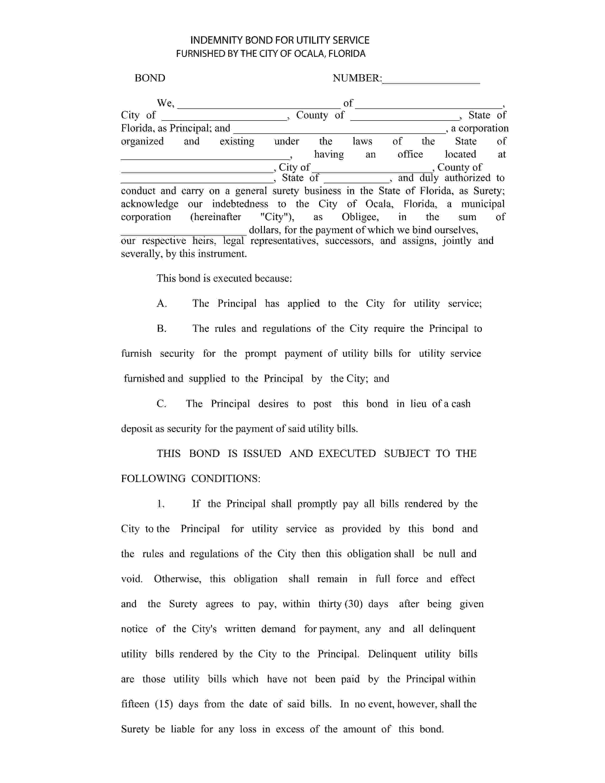 The Florida City Of Ocala Utility Services Ocala - City Utility Deposit Bond starts at $100 plus shipping costs and fees. Fill out the form to buy your bond instantly!