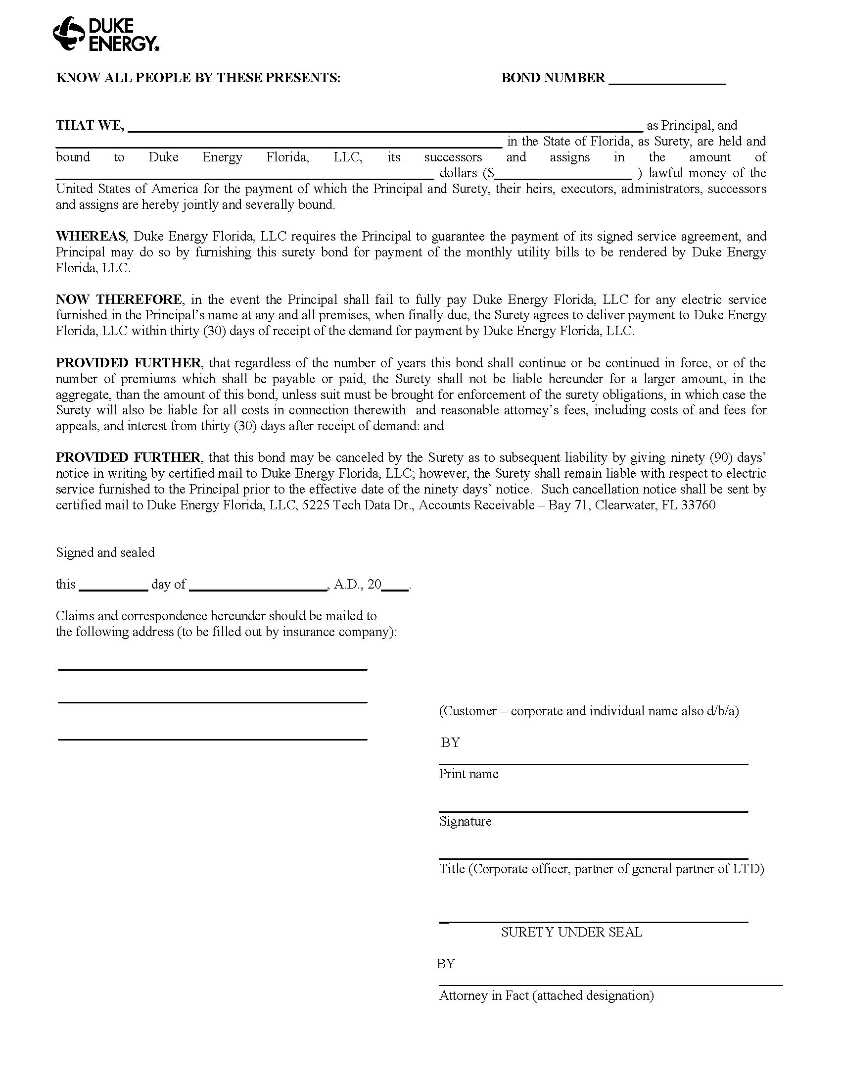 The Duke Energy Florida, LLC Utility Deposit Bond starts at $100 plus shipping costs and fees. Fill out the form to buy your bond instantly!