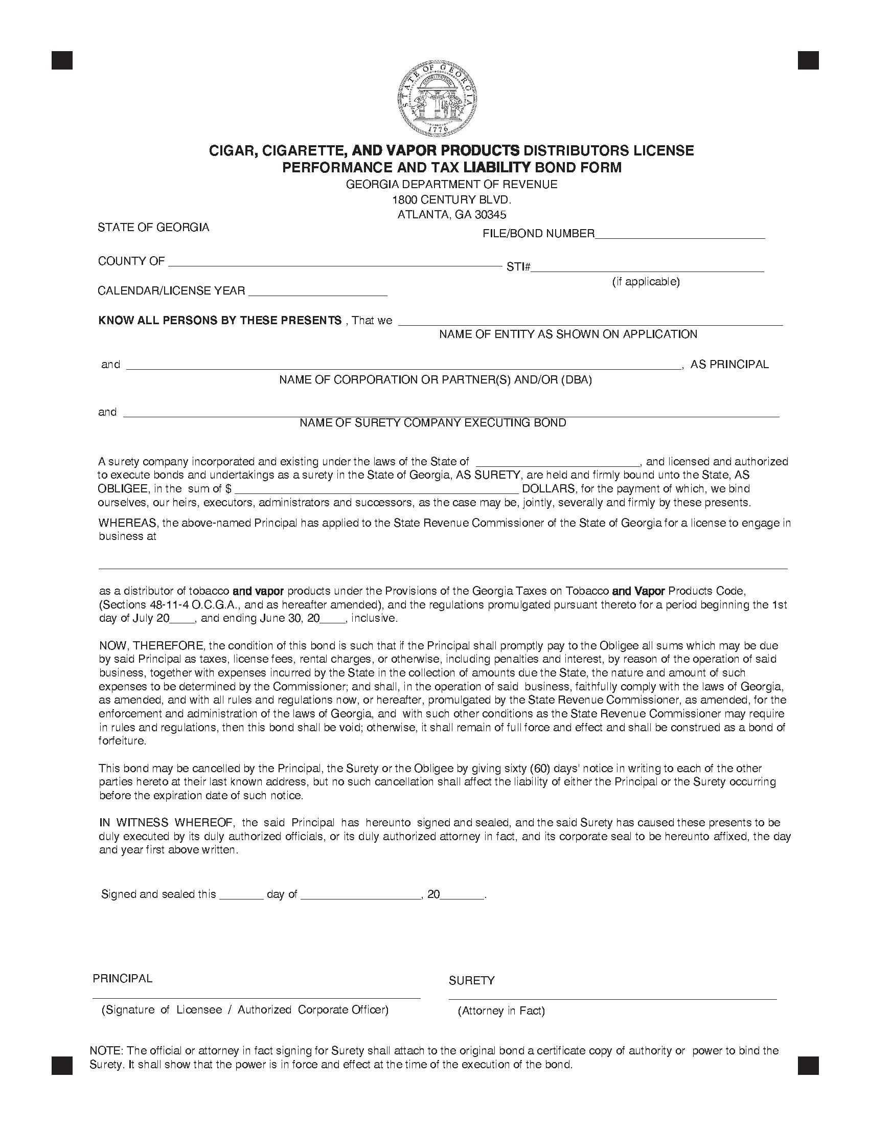 The Georgia Cigar, Cigarette, and Vapor Products Distributor License Performance and Tax Liability Bond starts at $100 plus shipping costs and fees. Fill out the form to buy your bond instantly!