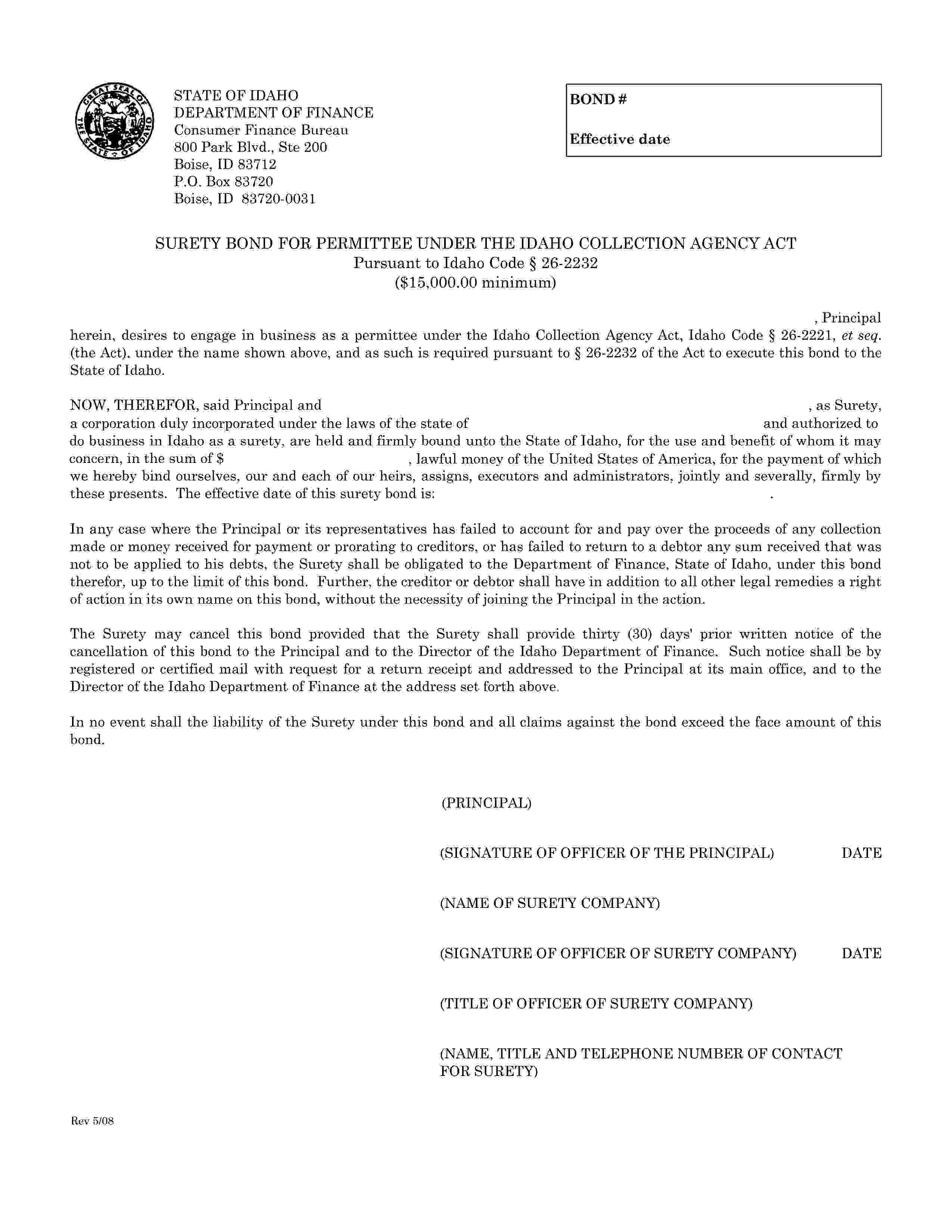 The Idaho Collection Agency License Bond starts at $150 plus shipping costs and fees. Fill out the form to buy your bond instantly!
