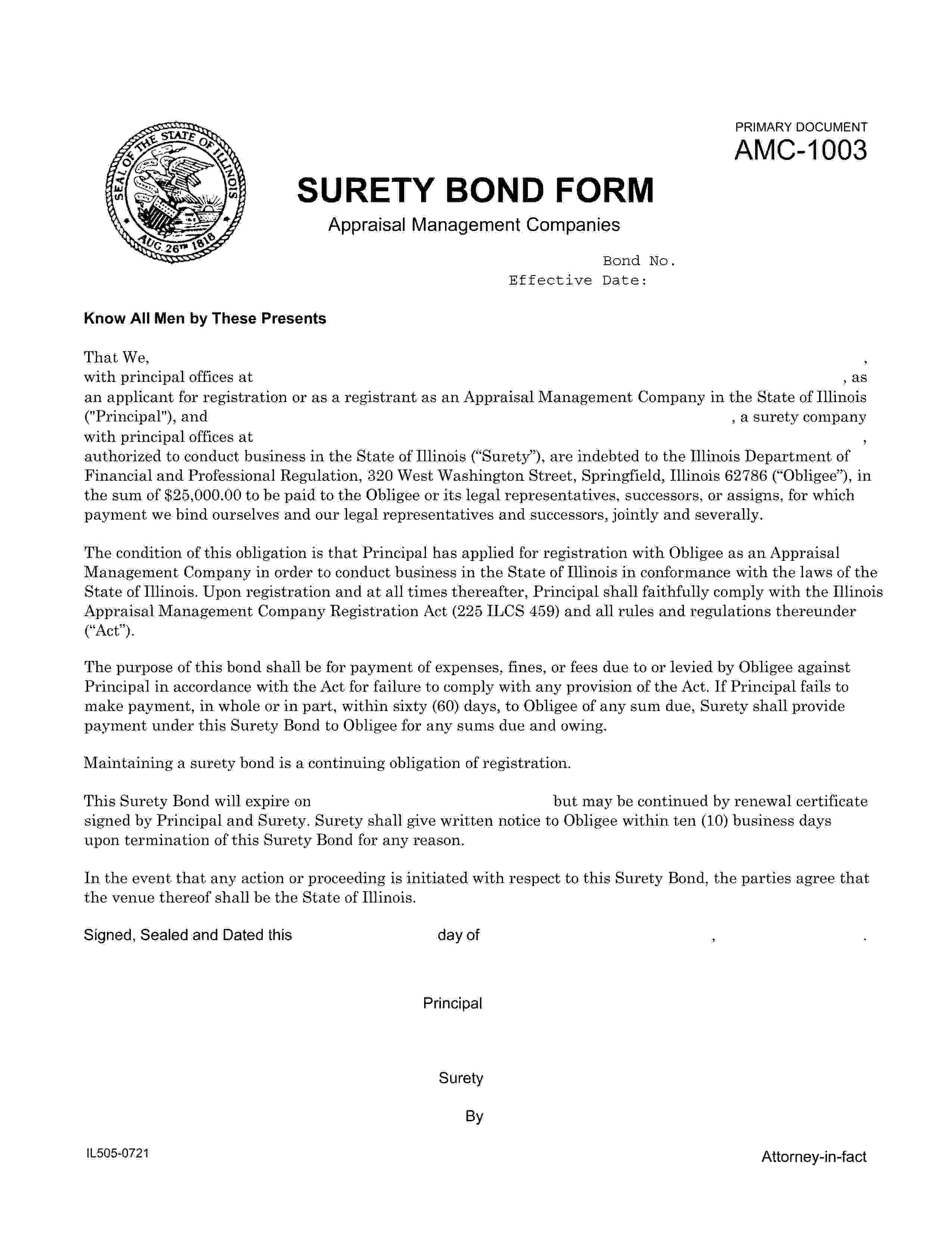 The Illinois Appraisal Management Company Bond starts at $250 plus shipping costs and fees. Fill out the form to buy your bond instantly!