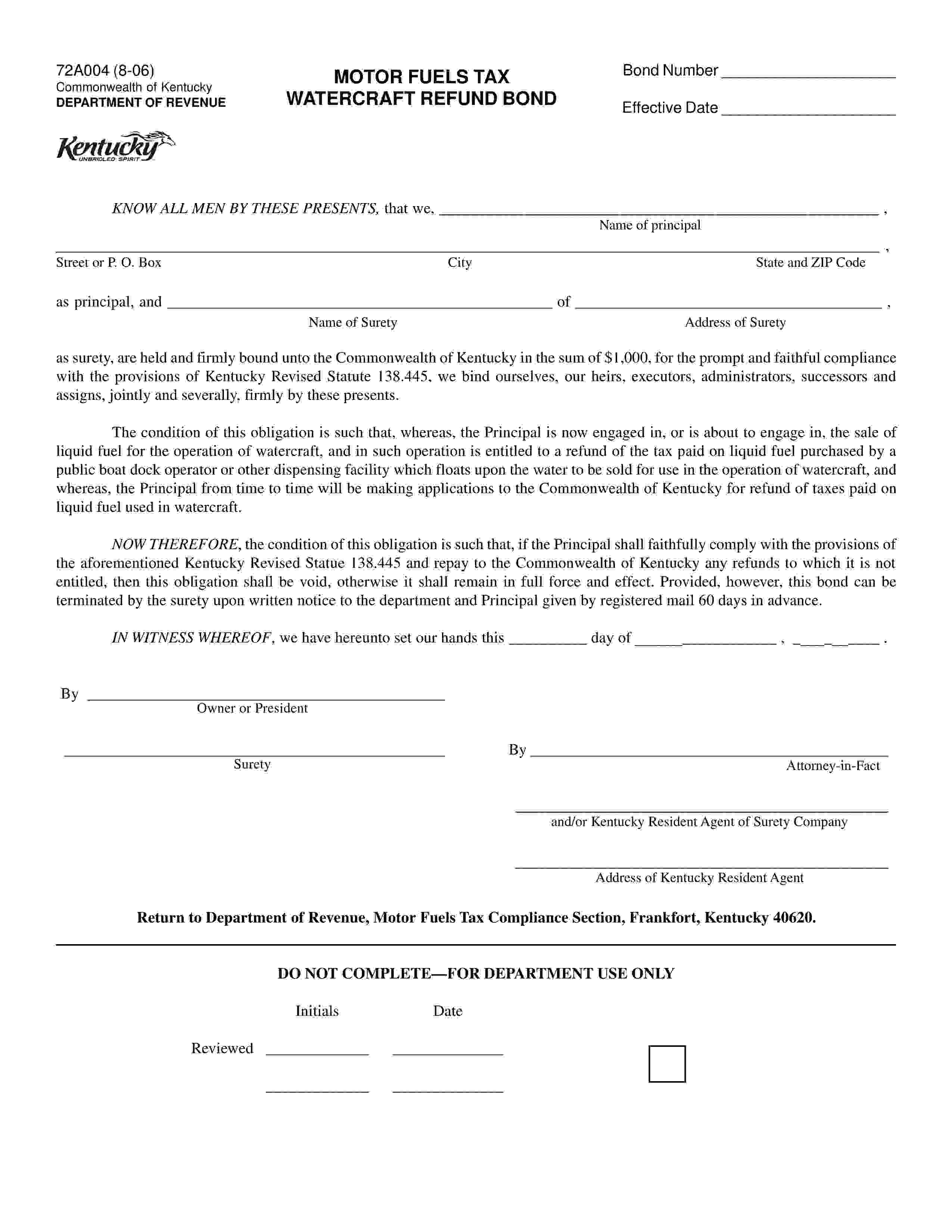 The Kentucky Motor Fuels Tax Watercraft Refund Bond starts at $100 plus shipping costs and fees. Fill out the form to buy your bond instantly!