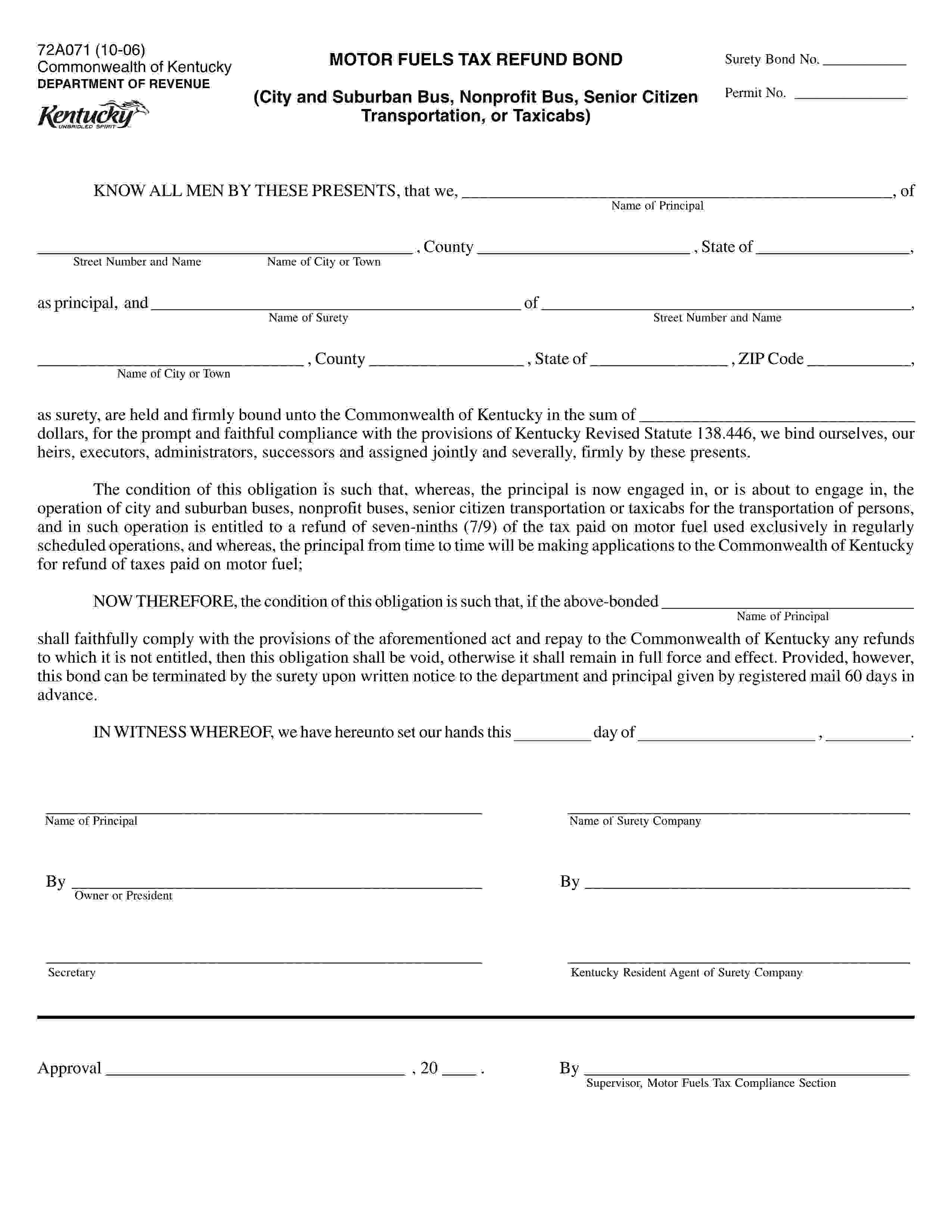 The Kentucky Motor Fuels Tax Refund (City and Suburban Bus, Nonprofit Bus, Senior Citizen Transportation, or Taxicabs) Bond starts at $100 plus shipping costs and fees. Fill out the form to buy your bond instantly!