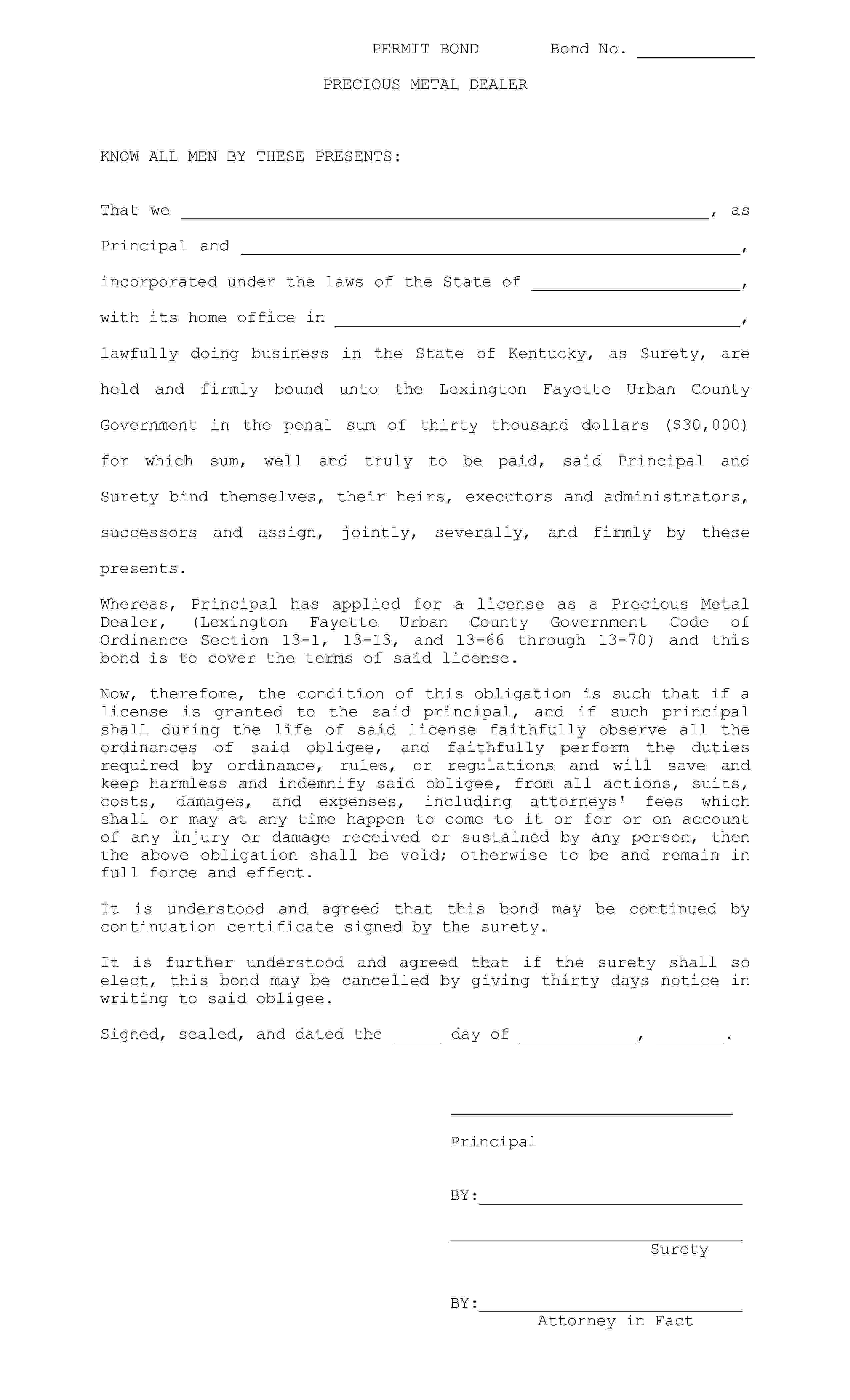 The Kentucky Lexington Fayette Urban County Government Precious Metal Dealer Bond starts at $300 plus shipping costs and fees. Fill out the form to buy your bond instantly!