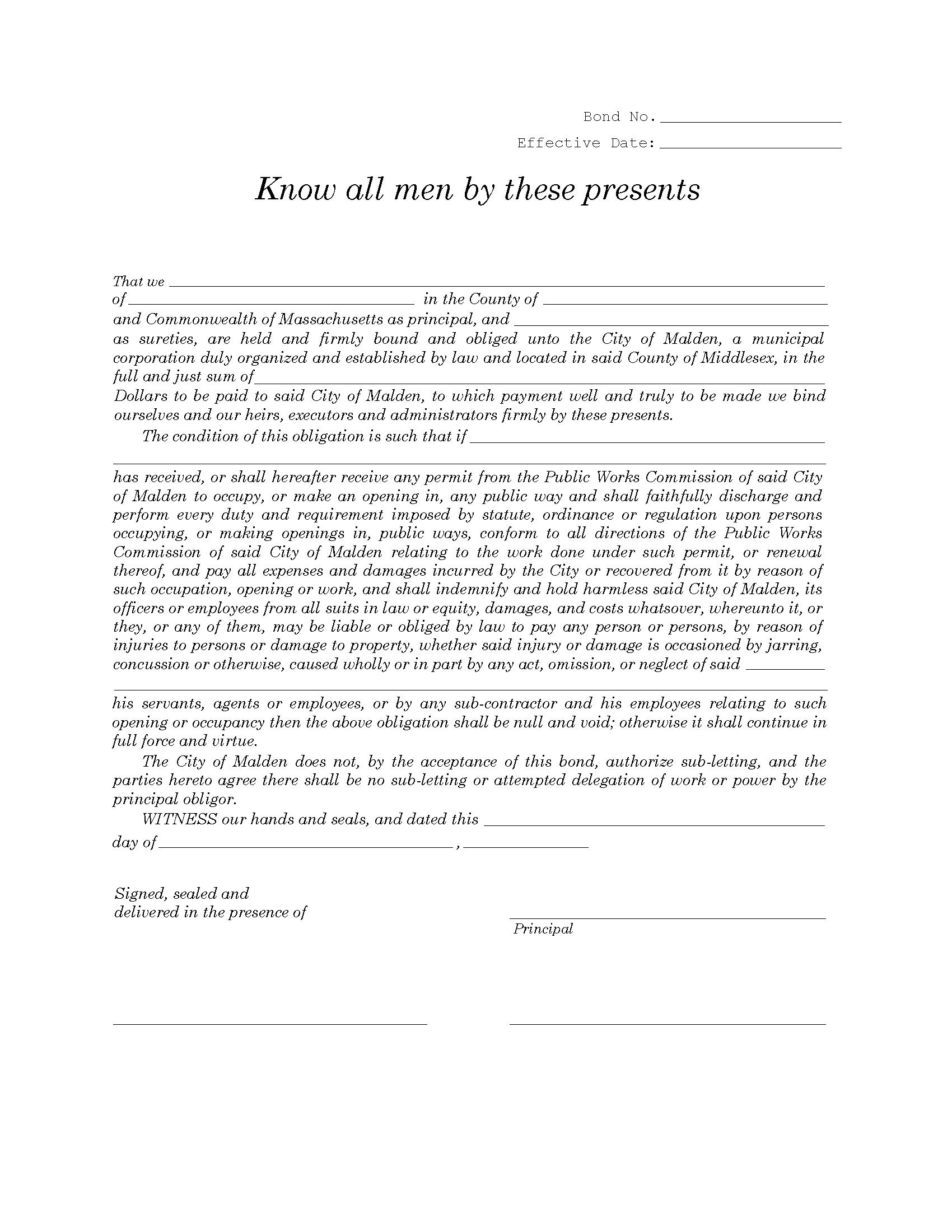The Massachusetts City of Malden Street Opening Permit Bond starts at $100 plus shipping costs and fees. Fill out the form to buy your bond instantly!