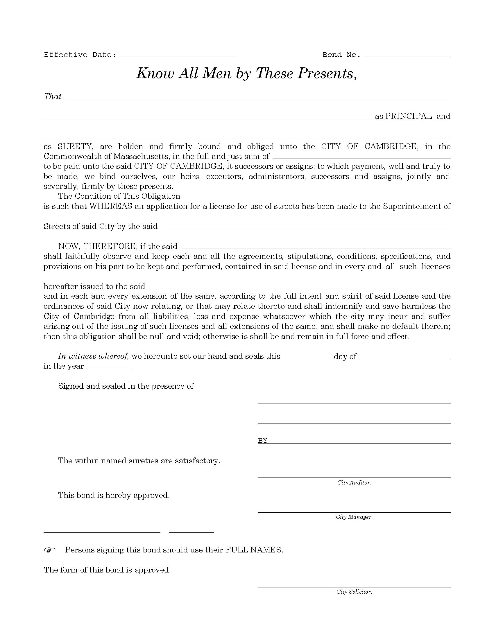 The Massachusetts City of Cambridge Use of Street Permit Bond starts at $100 plus shipping costs and fees. Fill out the form to buy your bond instantly!