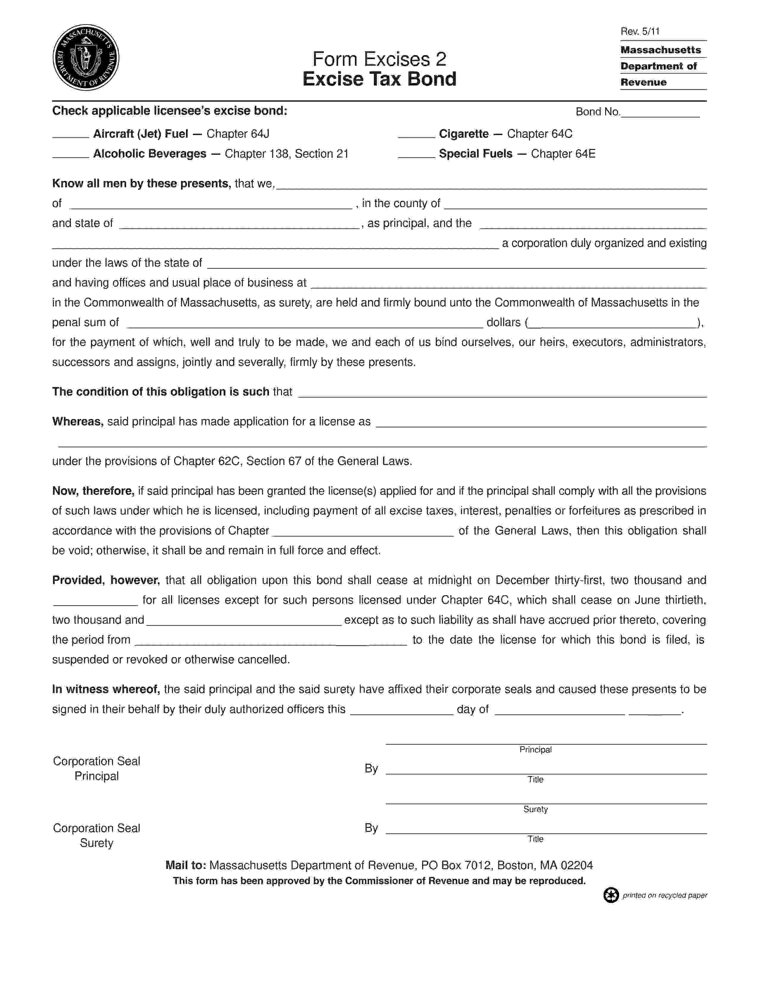 The Massachusetts Excise Tax - Alcoholic Beverages Bond starts at $100 plus shipping costs and fees. Fill out the form to buy your bond instantly!