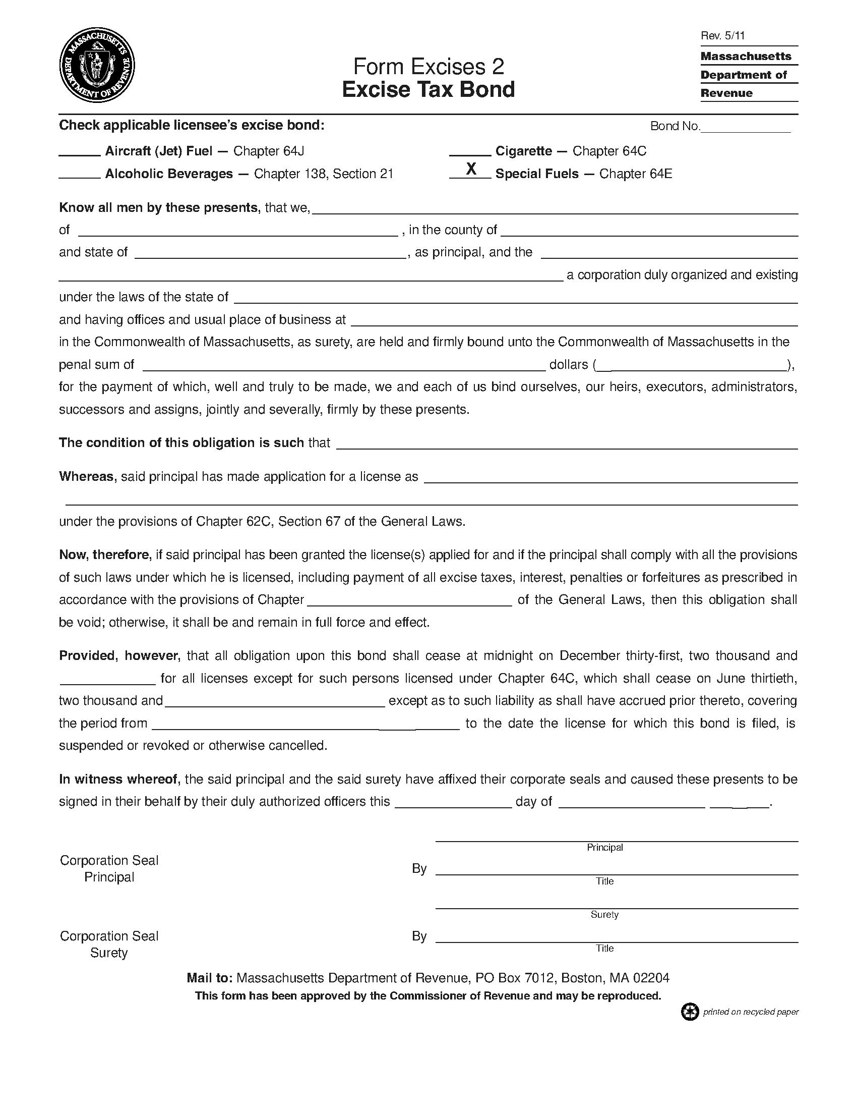 The Massachusetts Excise Tax - Special Fuels Bond starts at $100 plus shipping costs and fees. Fill out the form to buy your bond instantly!