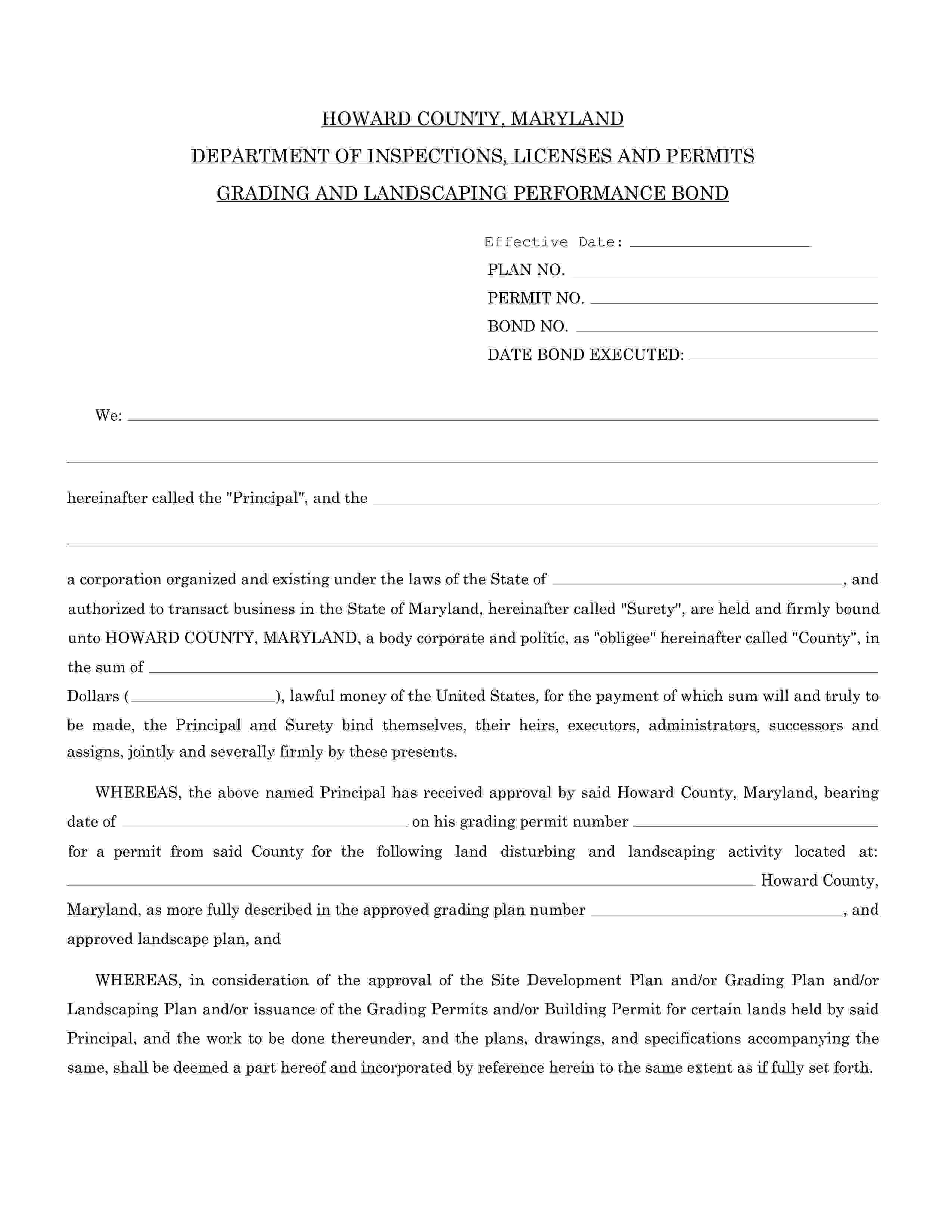 The Maryland Howard County Grading and Landscaping Performance Bond starts at $100 plus shipping costs and fees. Fill out the form to buy your bond instantly!