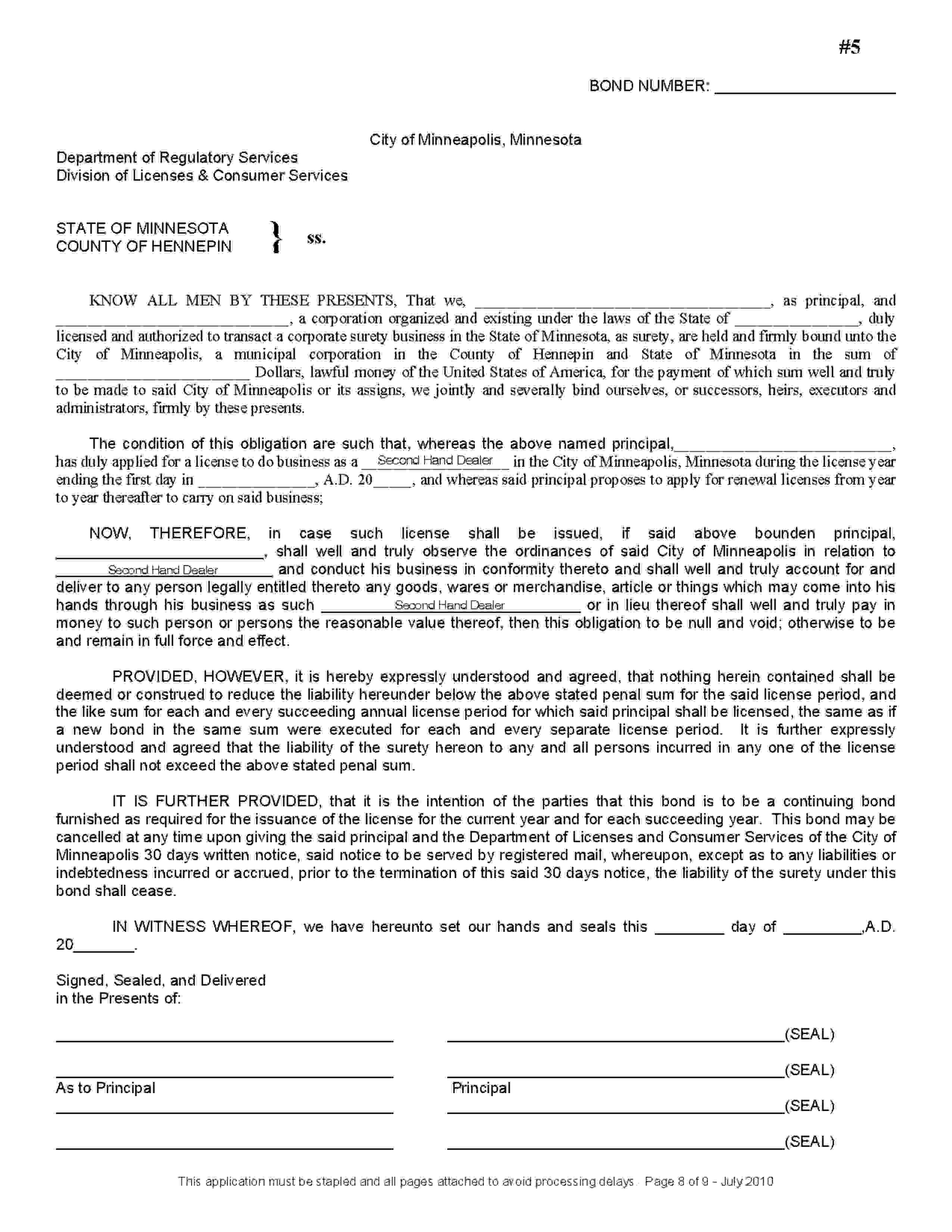 The Minnesota Minneapolis Secondhand Dealer Bond starts at $100 plus shipping costs and fees. Fill out the form to buy your bond instantly!