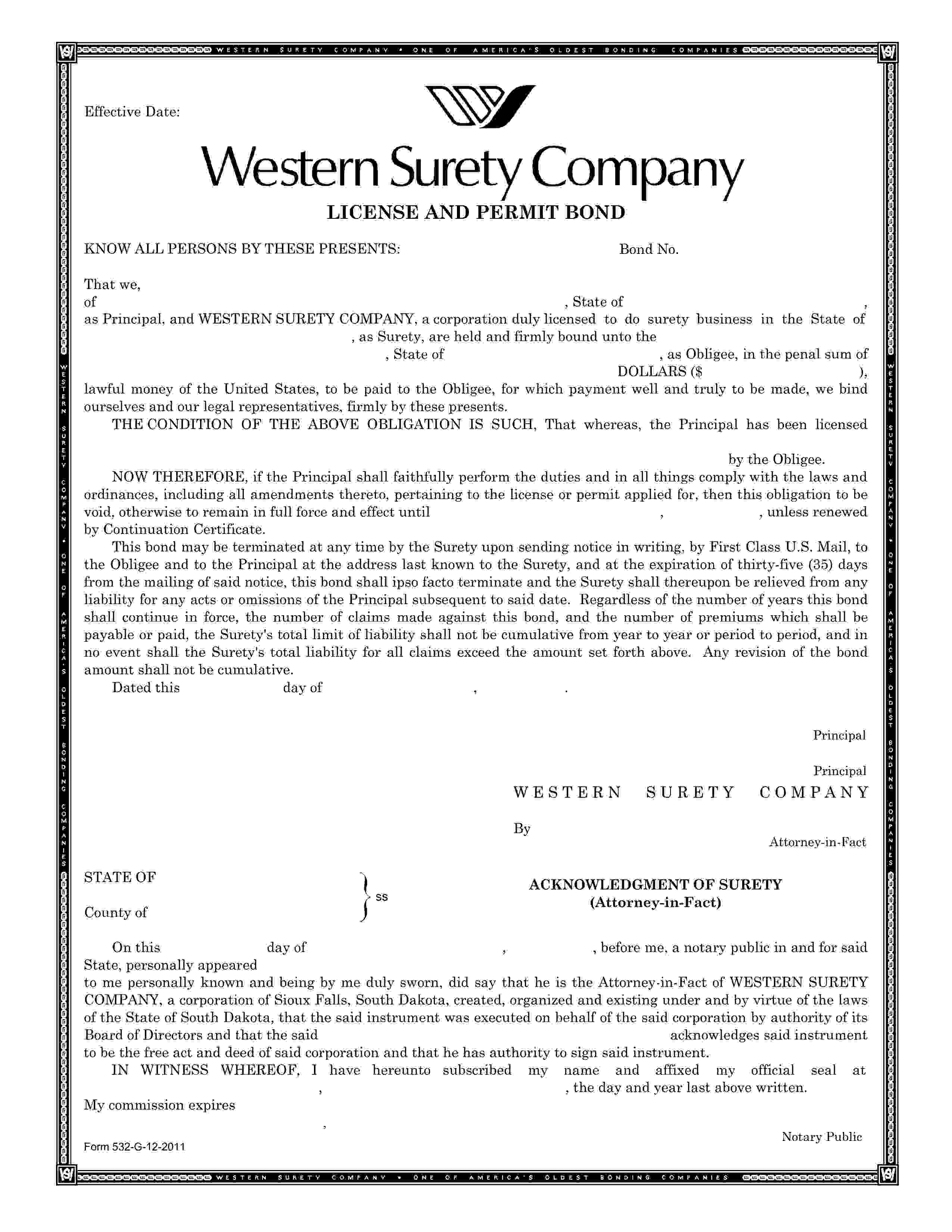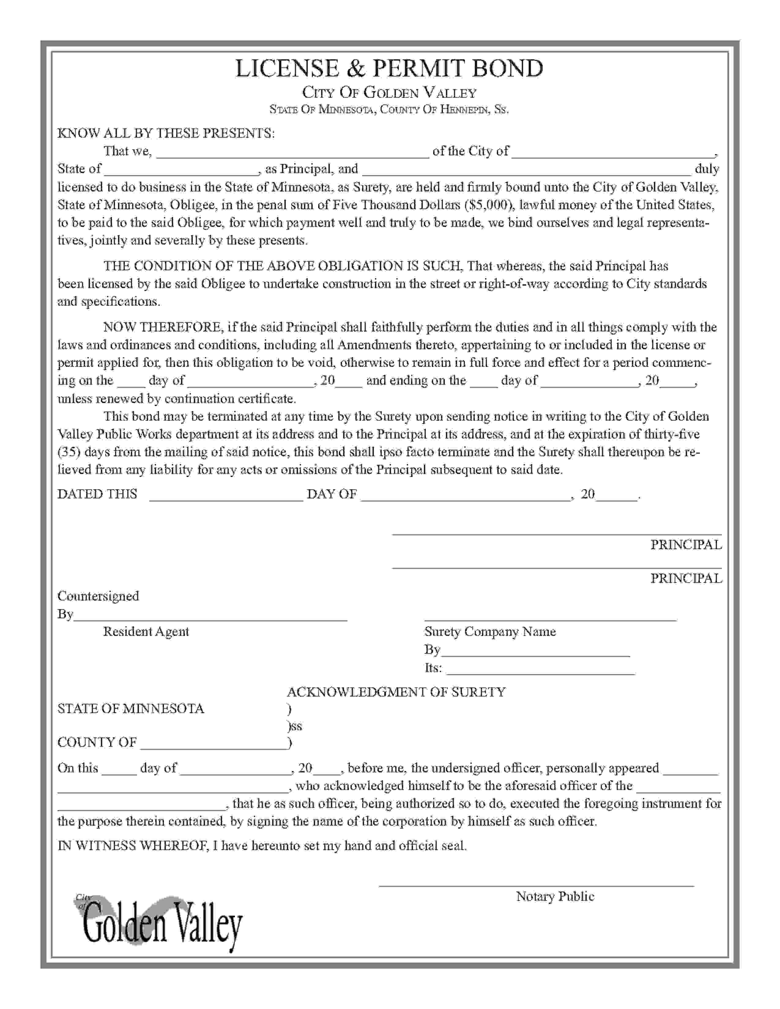 The Minnesota City of Golden Valley Right of Way License & Permit Bond starts at $100 plus shipping costs and fees. Fill out the form to buy your bond instantly!