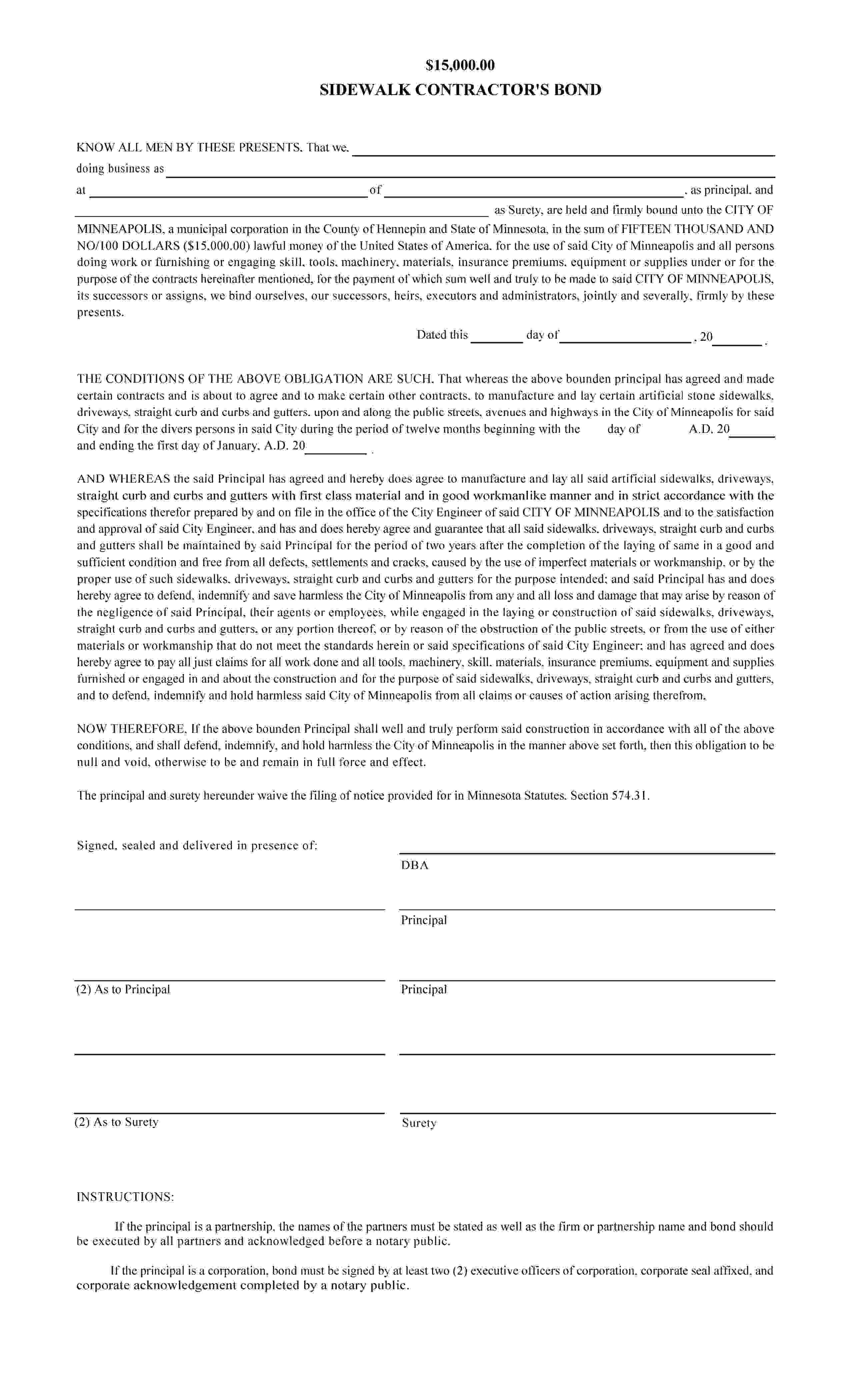 The Minnesota Minneapolis - City Sidewalk Contractor Bond starts at $112 plus shipping costs and fees. Fill out the form to buy your bond instantly!