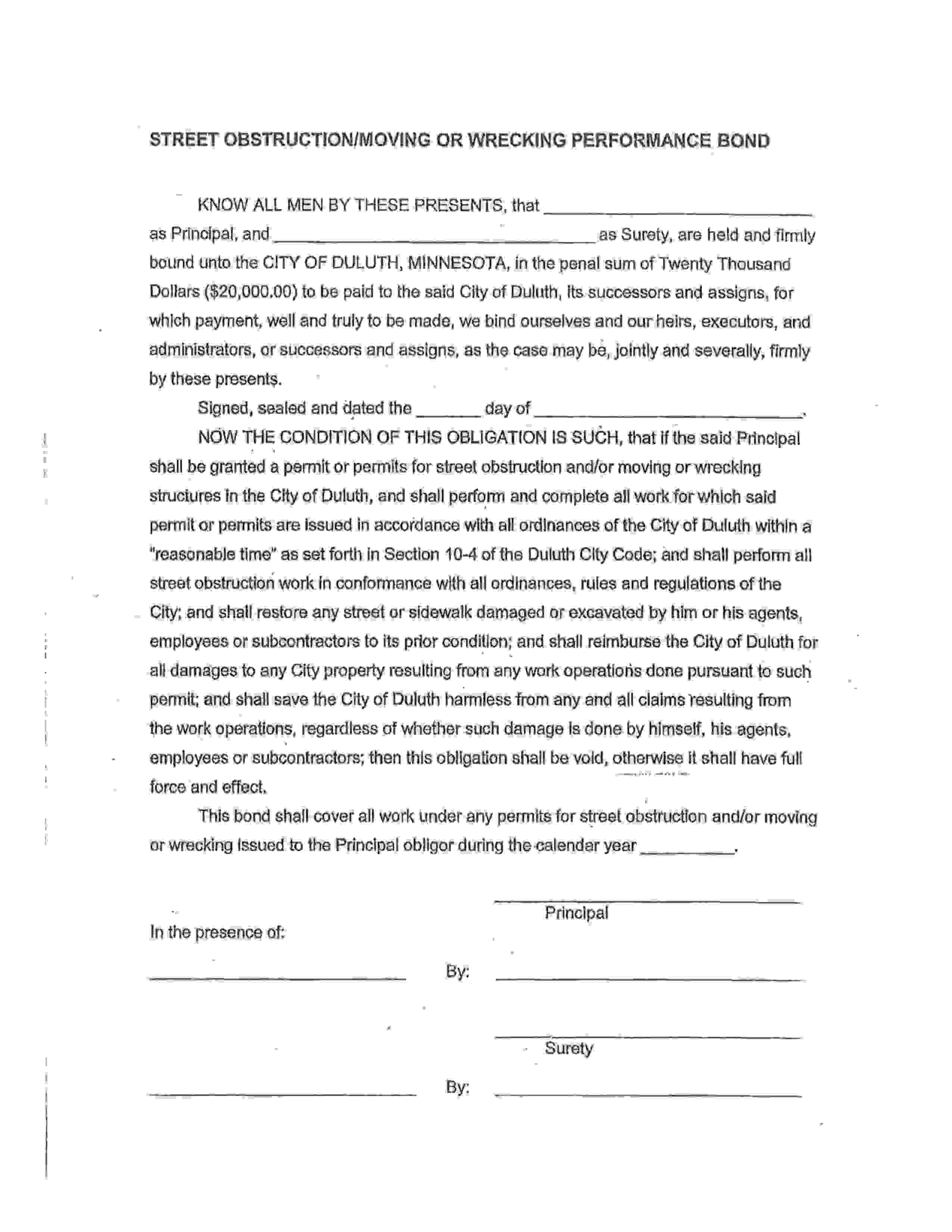 The Minnesota Duluth - City Street Obstruction/Moving or Wrecking Performance Bond starts at $114 plus shipping costs and fees. Fill out the form to buy your bond instantly!