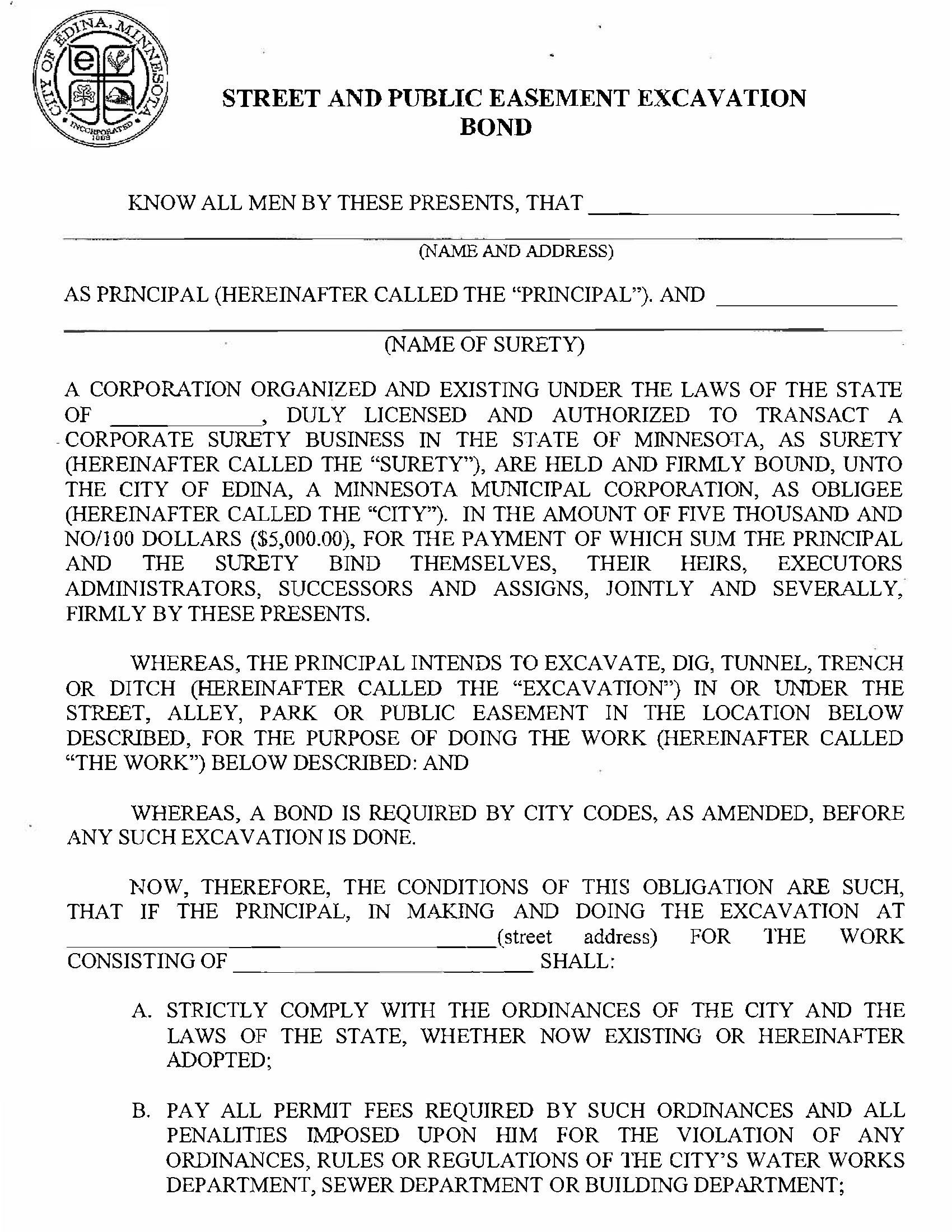 The Minnesota Edina - City Street and Public Easement Excavation Bond starts at $175 plus shipping costs and fees. Fill out the form to buy your bond instantly!