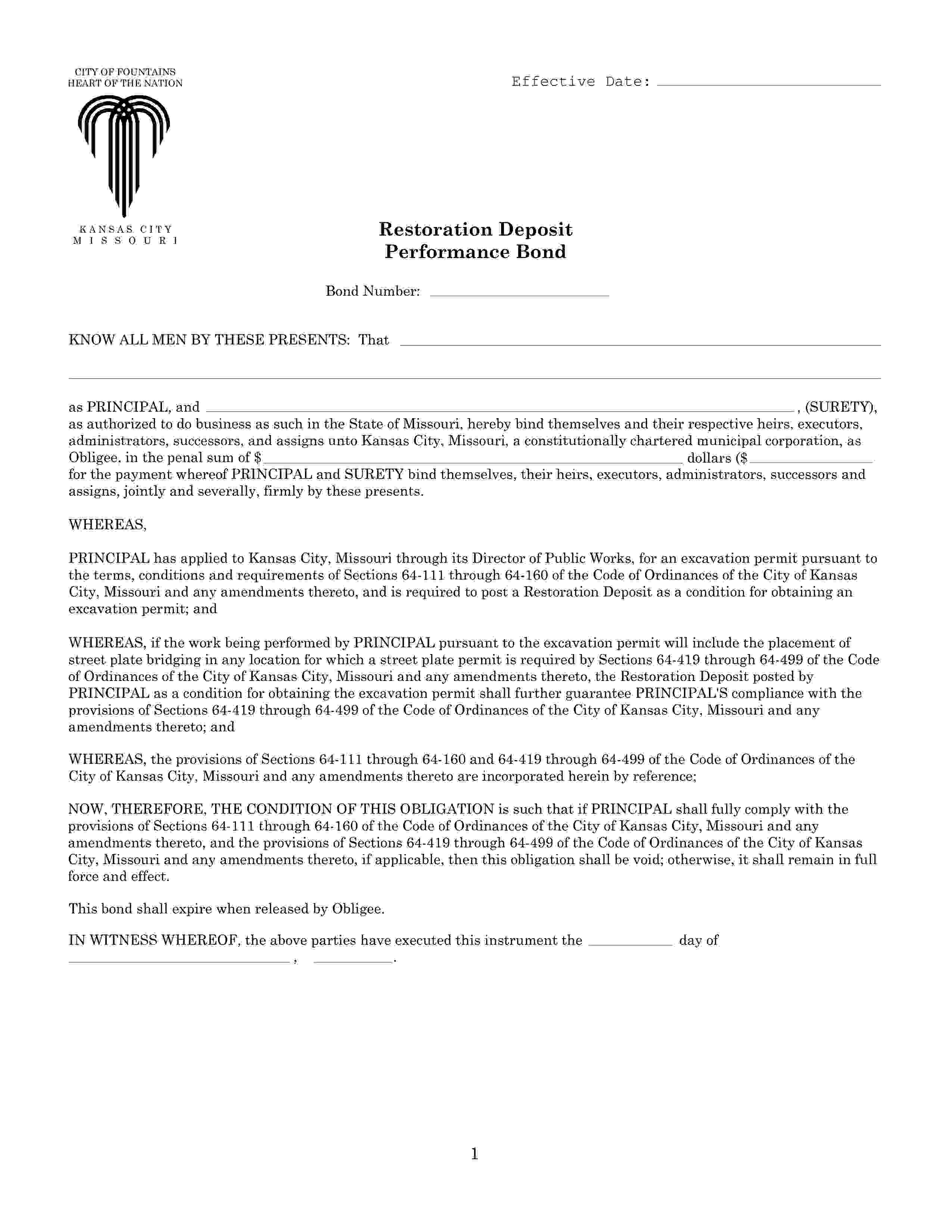 The Missouri Kansas City Excavation Permit / Restoration Deposit Performance Bond starts at $100 plus shipping costs and fees. Fill out the form to buy your bond instantly!