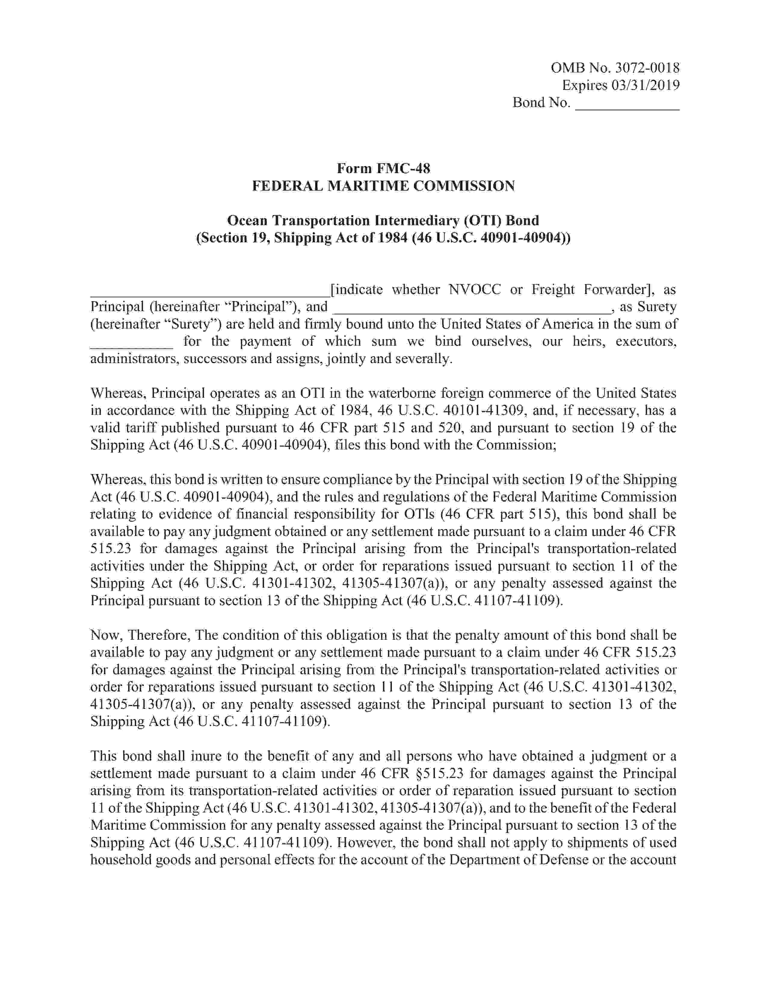 The Federal Maritime Commission Ocean Transportation Intermediary Non Vessel Operating Common Carriers - Dupliate Bond starts at $750 plus shipping costs and fees. Fill out the form to buy your bond instantly!
