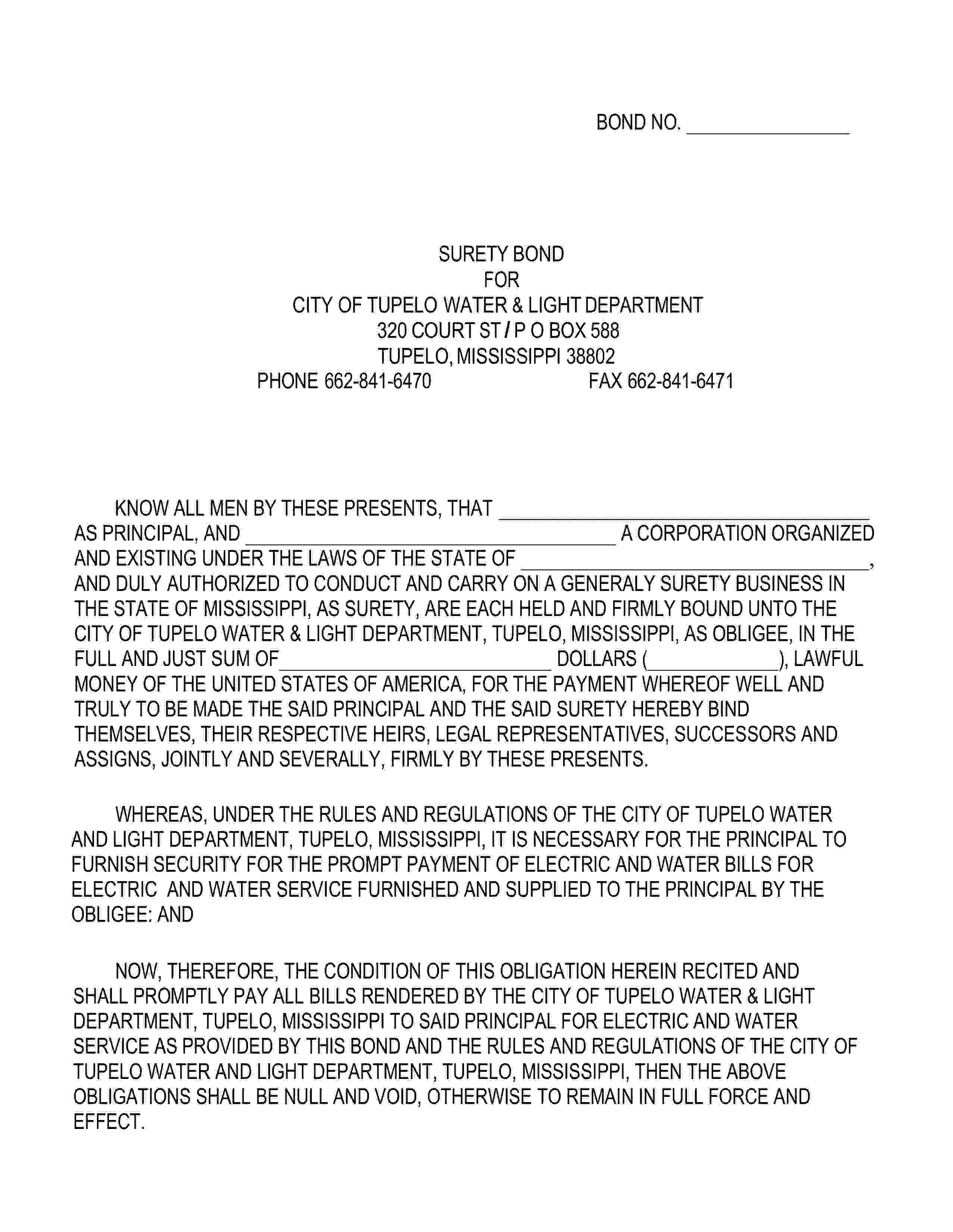 The Mississippi City of Tupelo Water & Light Department Utility Deposit Bond starts at $100 plus shipping costs and fees. Fill out the form to buy your bond instantly!