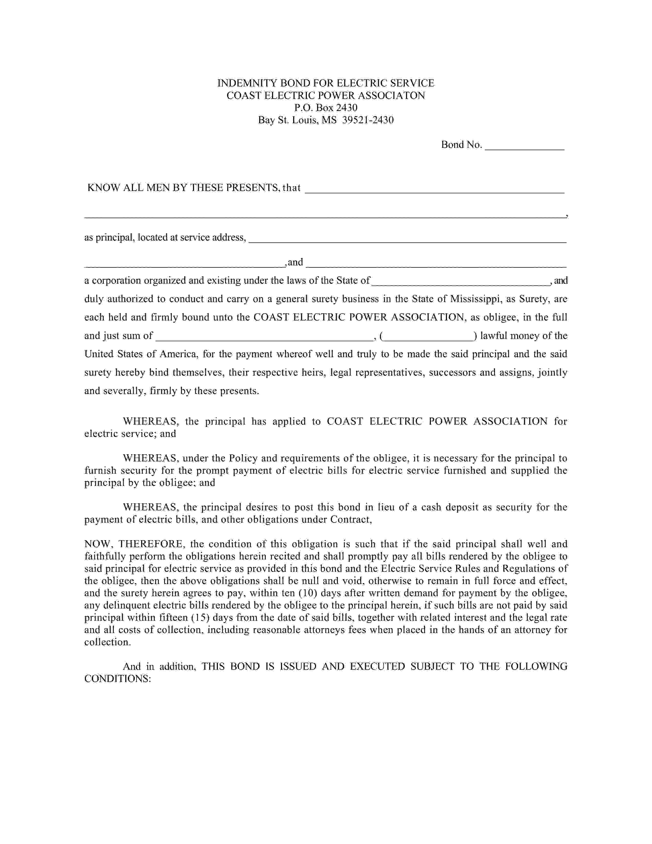 The Coast Electric Power Association Utility Deposit Bond starts at $100 plus shipping costs and fees. Fill out the form to buy your bond instantly!