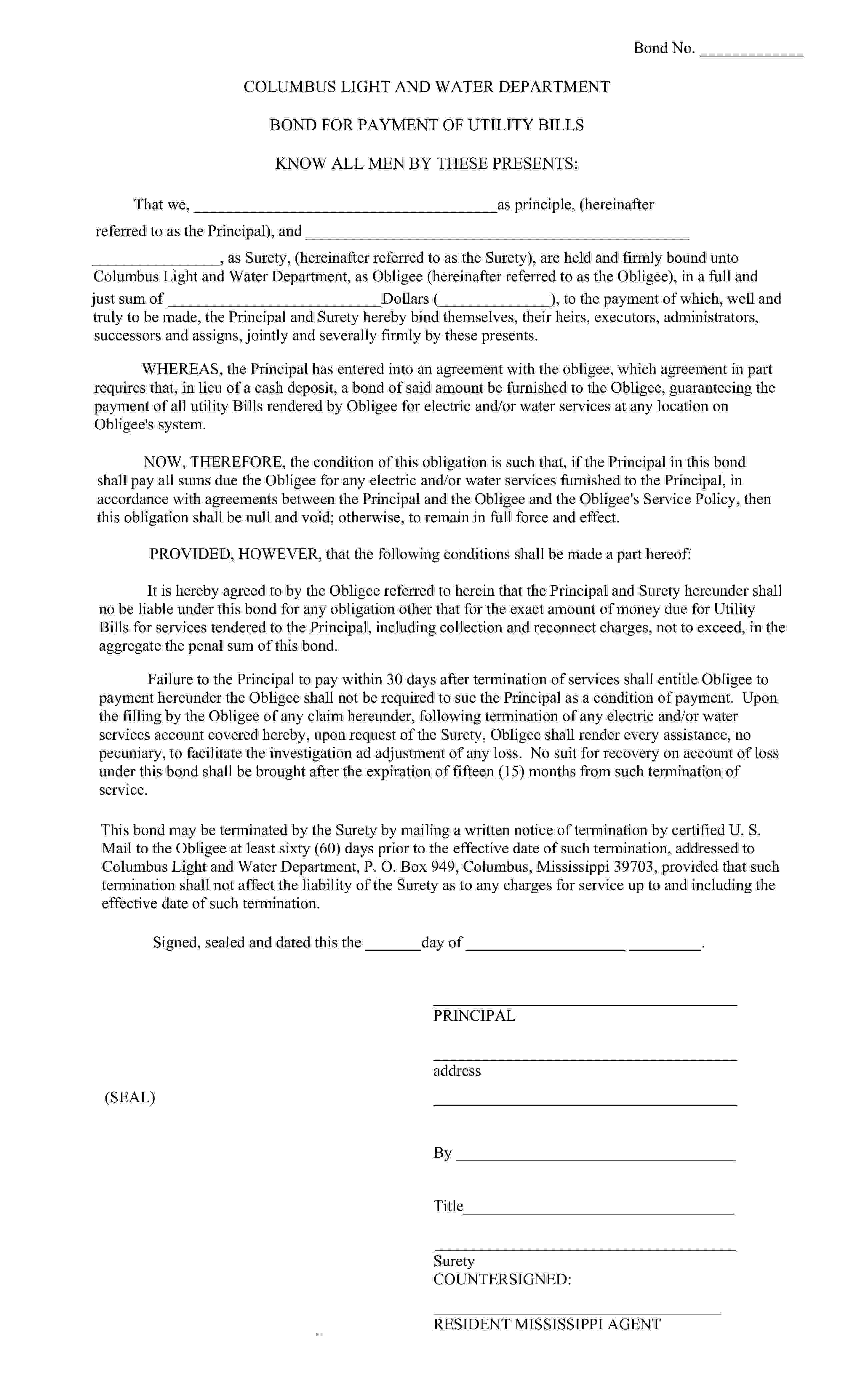 The Mississippi Columbus Light and Water Department Utility Deposit Bond starts at $100 plus shipping costs and fees. Fill out the form to buy your bond instantly!