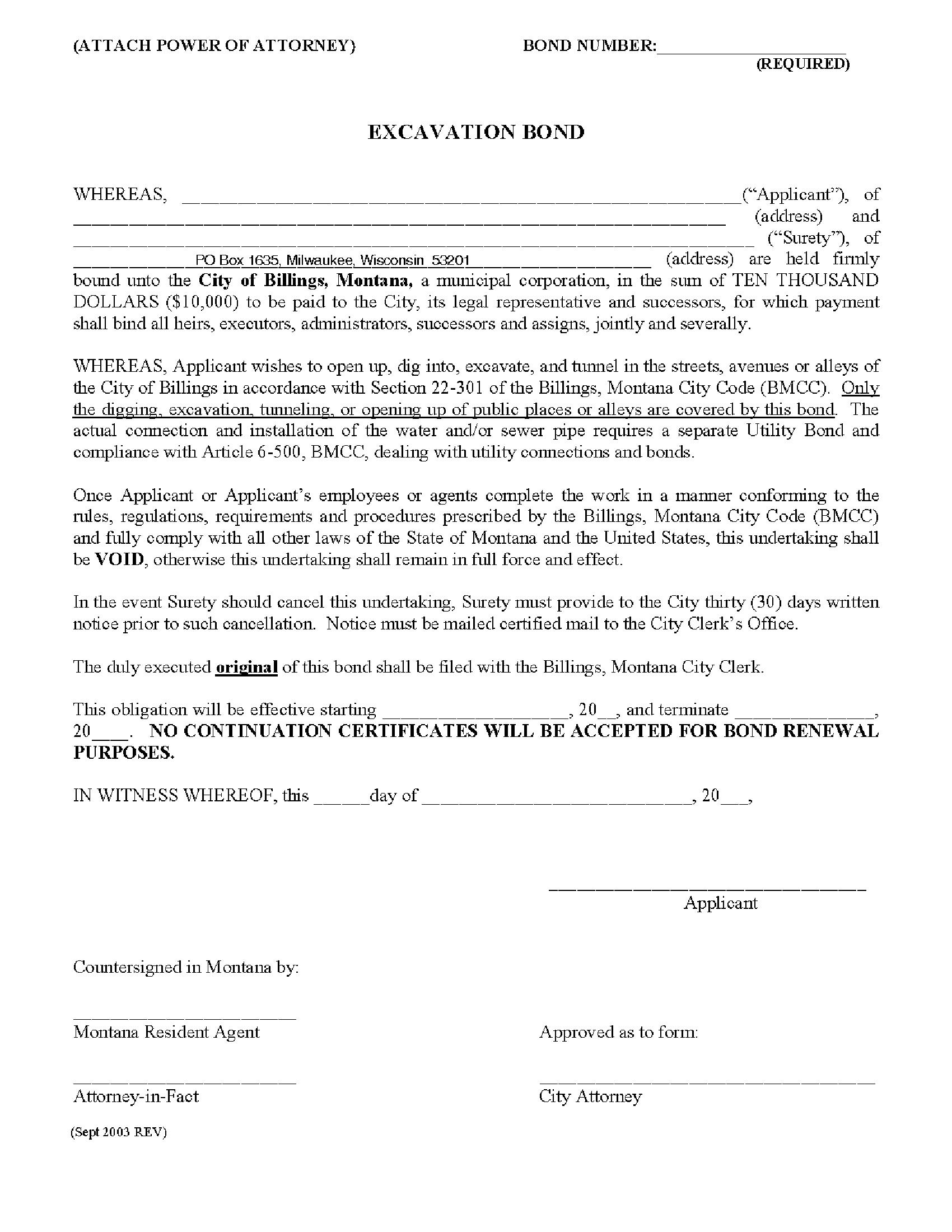 The Montana City of Billings, Montana Billings - City Excavation Bond starts at $100 plus shipping costs and fees. Fill out the form to buy your bond instantly!