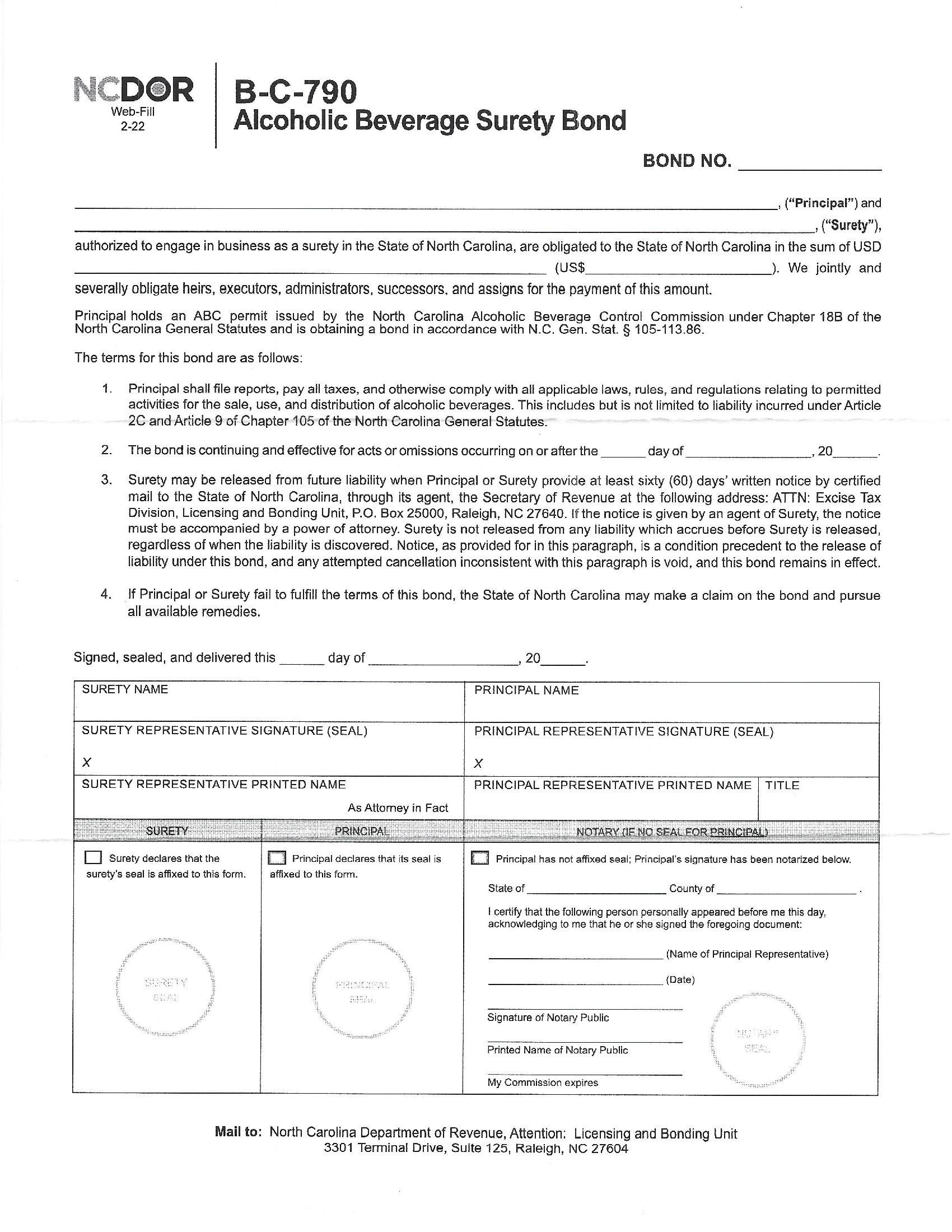 The North Carolina Alcoholic Beverage Wholesalers or Importers Bond starts at $100 plus shipping costs and fees. Fill out the form to buy your bond instantly!
