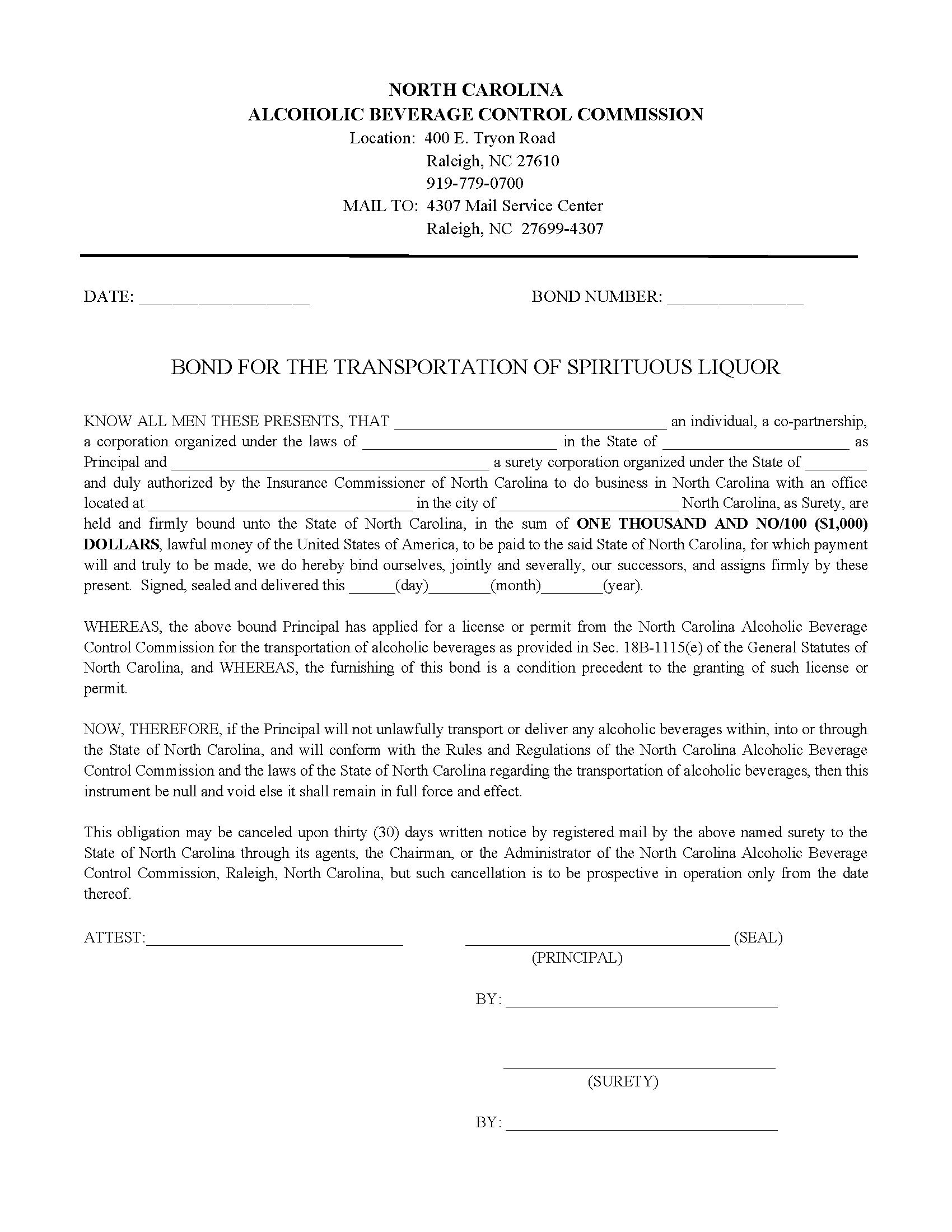 The North Carolina Transportation of Spirituous Liquor Bond starts at $100 plus shipping costs and fees. Fill out the form to buy your bond instantly!