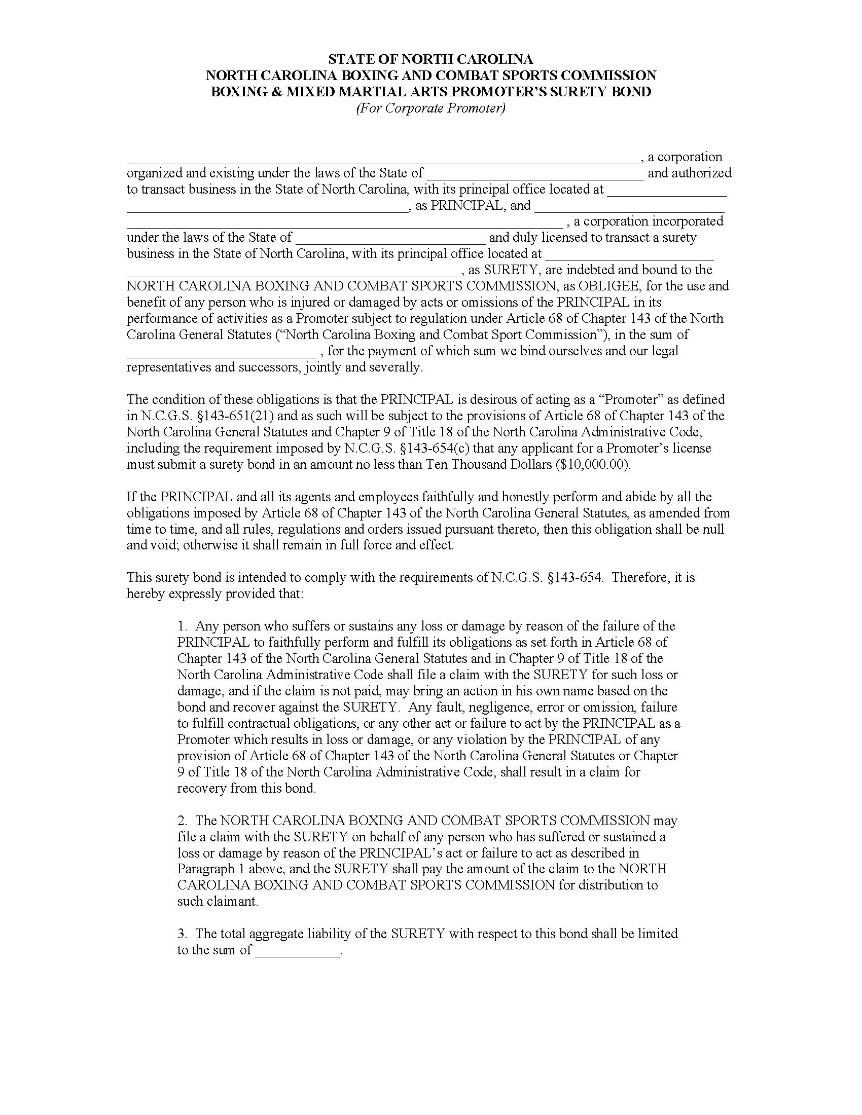 The North Carolina Boxing & Mixed Martial Arts Promoter (Corporate) Bond starts at $100 plus shipping costs and fees. Fill out the form to buy your bond instantly!