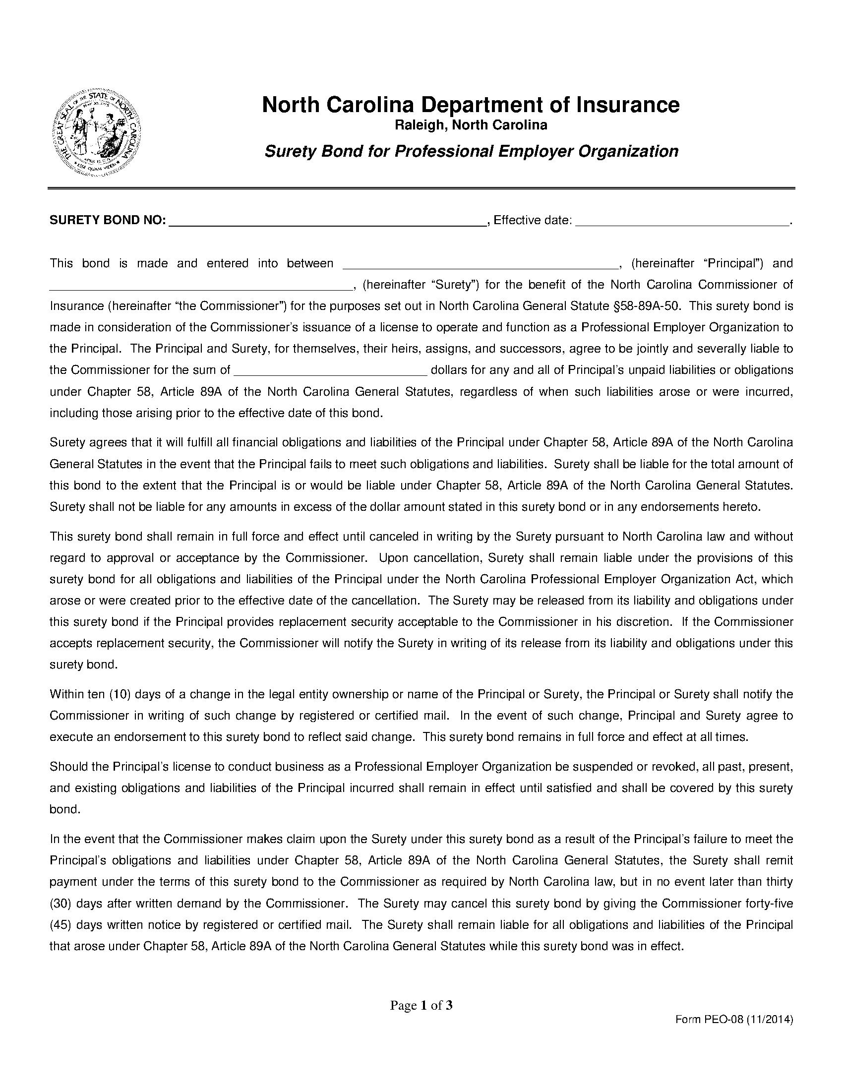 The North Carolina Professional Employer Organization Bond starts at $1000 plus shipping costs and fees. Fill out the form to buy your bond instantly!