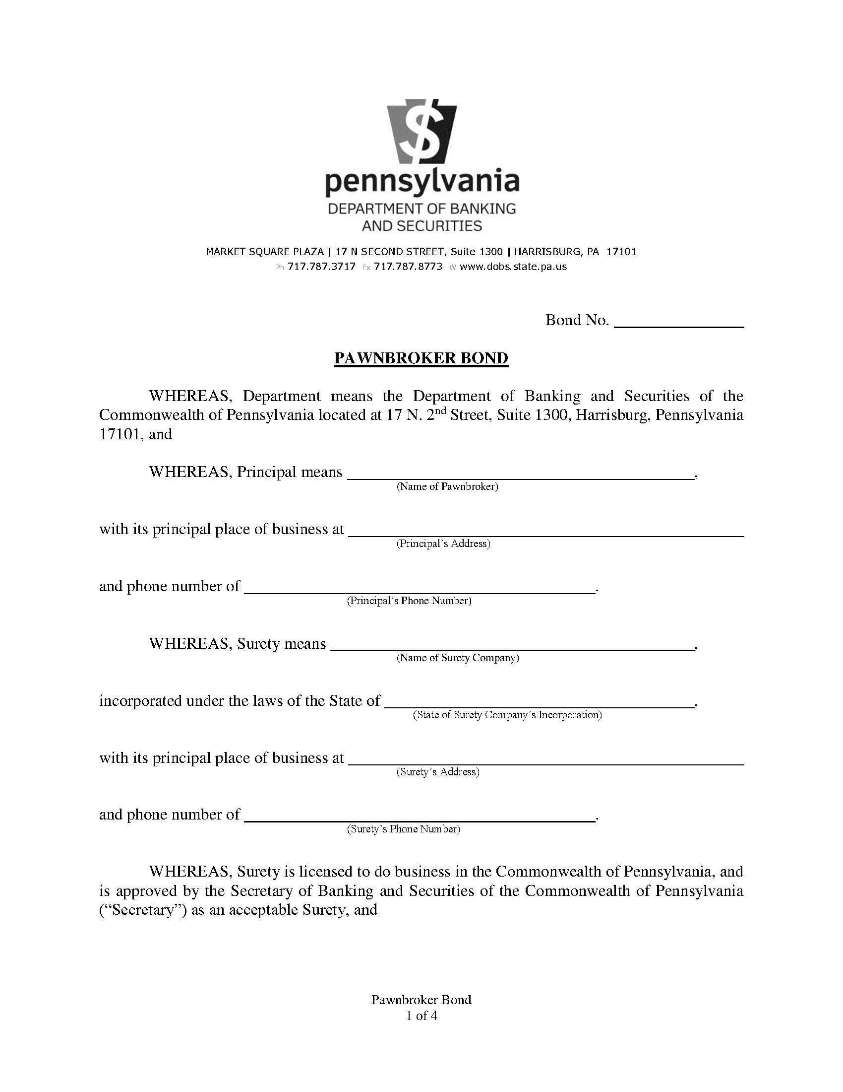 The Pennsylvania Pawnbroker Bond starts at $100 plus shipping costs and fees. Fill out the form to buy your bond instantly!