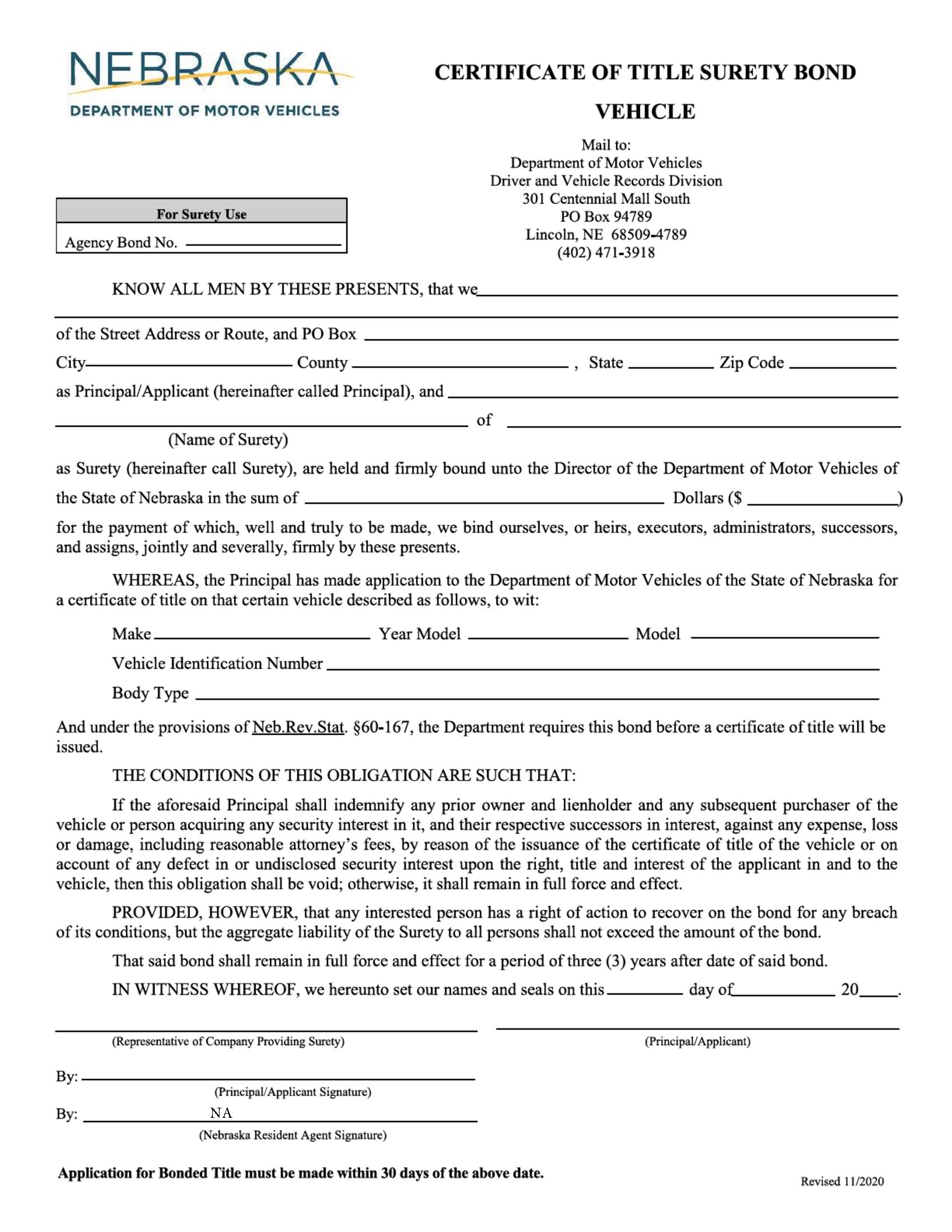 The Nebraska Motor Vehicle Certificate of Title Bond starts at $85 plus shipping costs and fees. Fill out the form to buy your bond instantly!