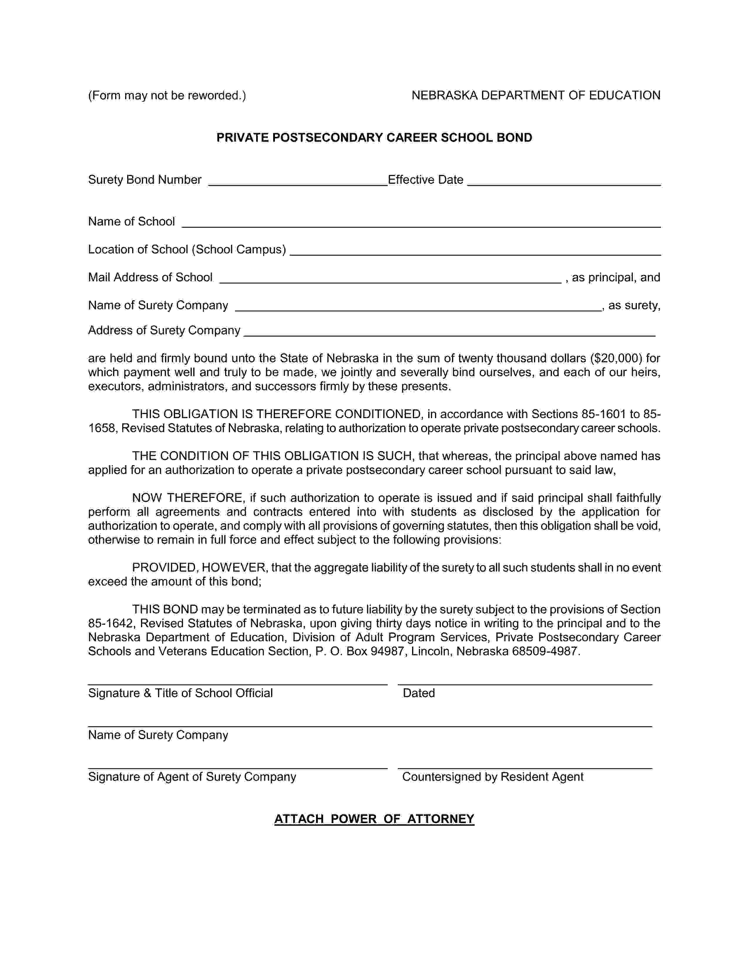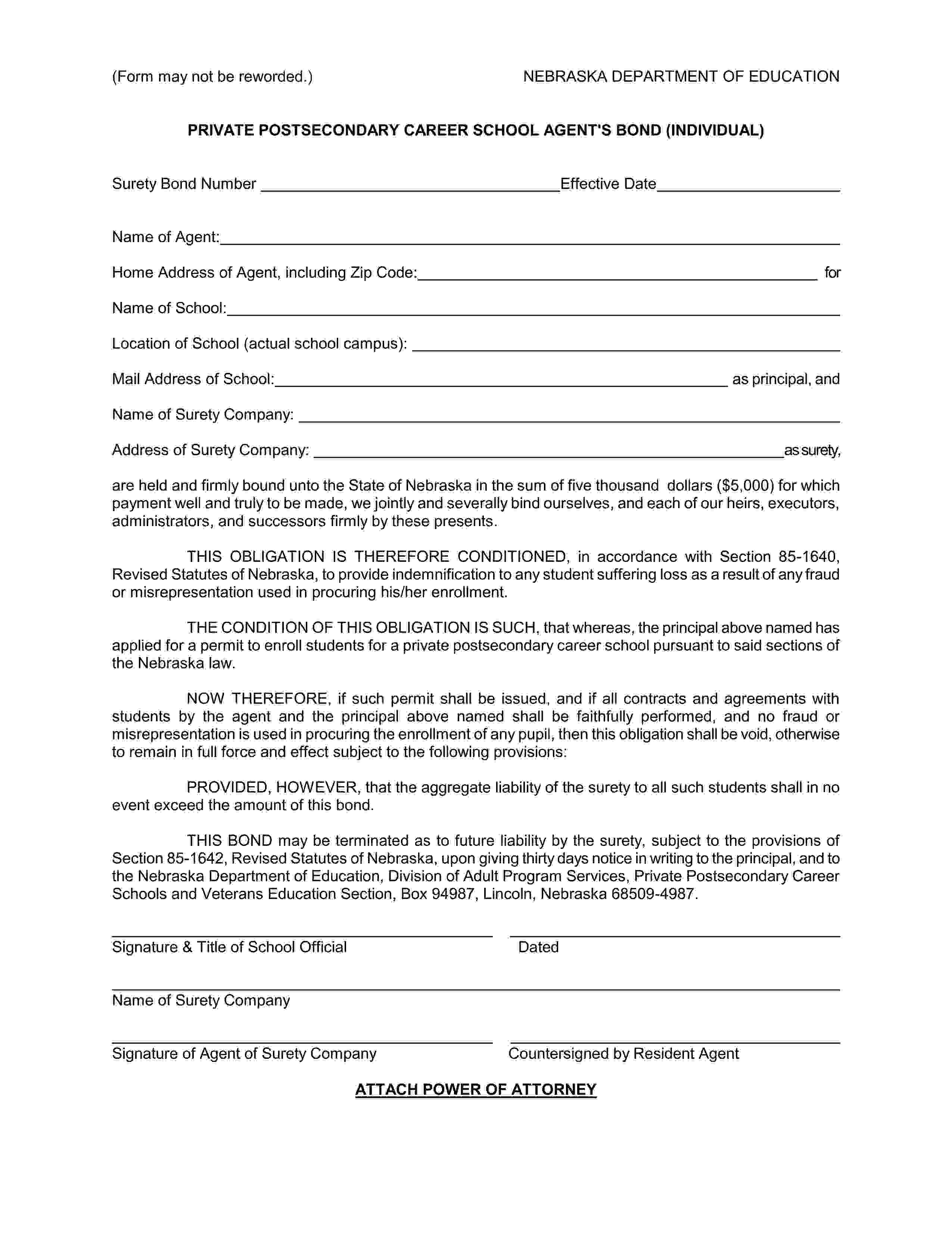 The Nebraska Private Postsecondary Career School Agent (Blanket): $5,000 per agent Bond starts at $100 plus shipping costs and fees. Fill out the form to buy your bond instantly!