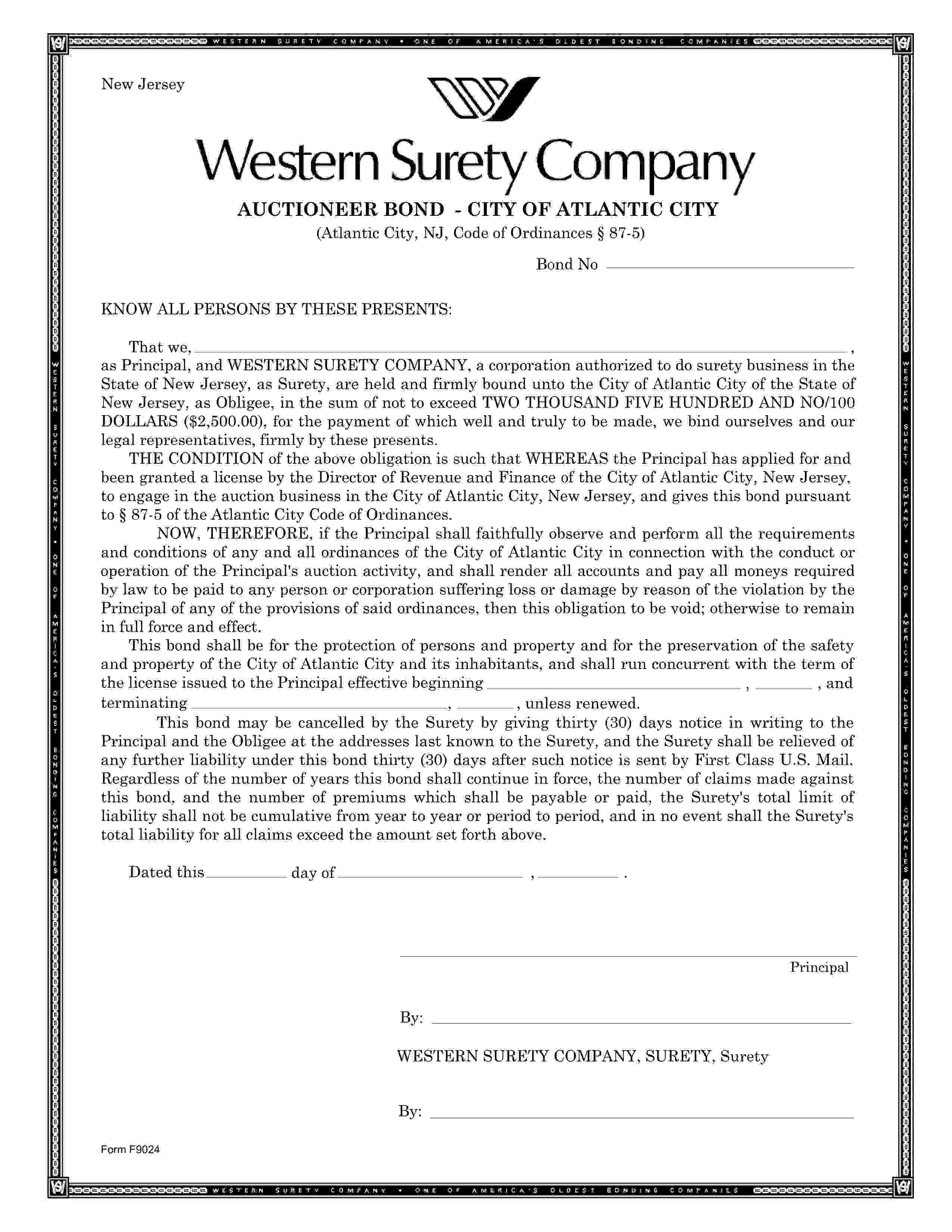 The New Jersey City of Atlantic City Auctioneer Bond starts at $100 plus shipping costs and fees. Fill out the form to buy your bond instantly!