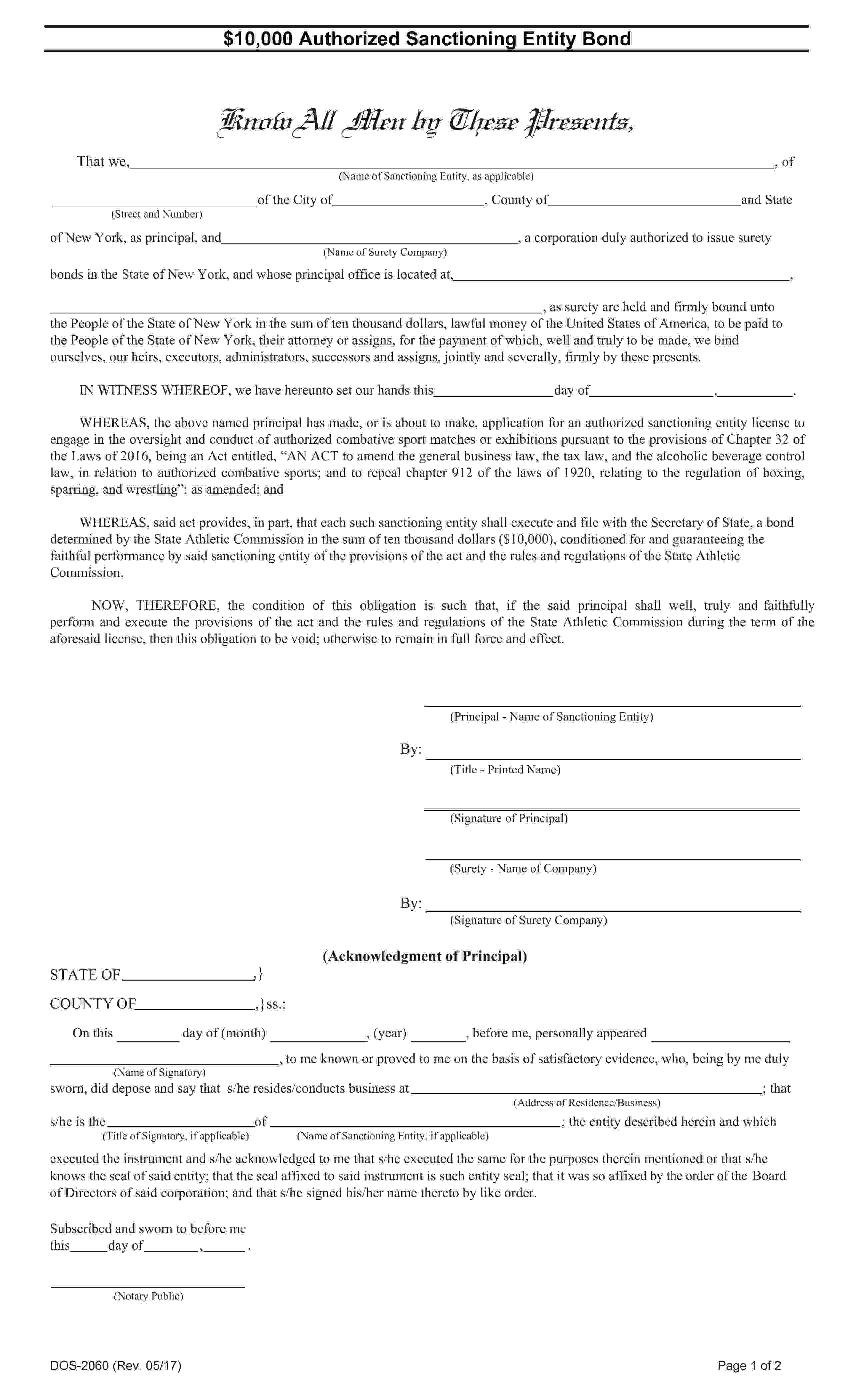 The New York Authorized Sanctioning Entity Bond starts at $100 plus shipping costs and fees. Fill out the form to buy your bond instantly!