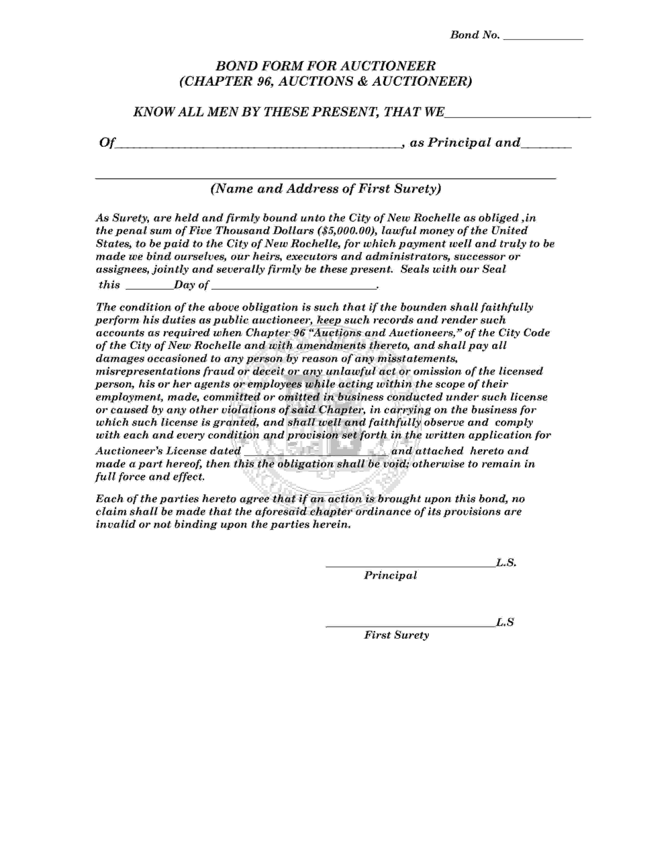 The New York City of New Rochelle Auctioneer License Bond starts at $100 plus shipping costs and fees. Fill out the form to buy your bond instantly!