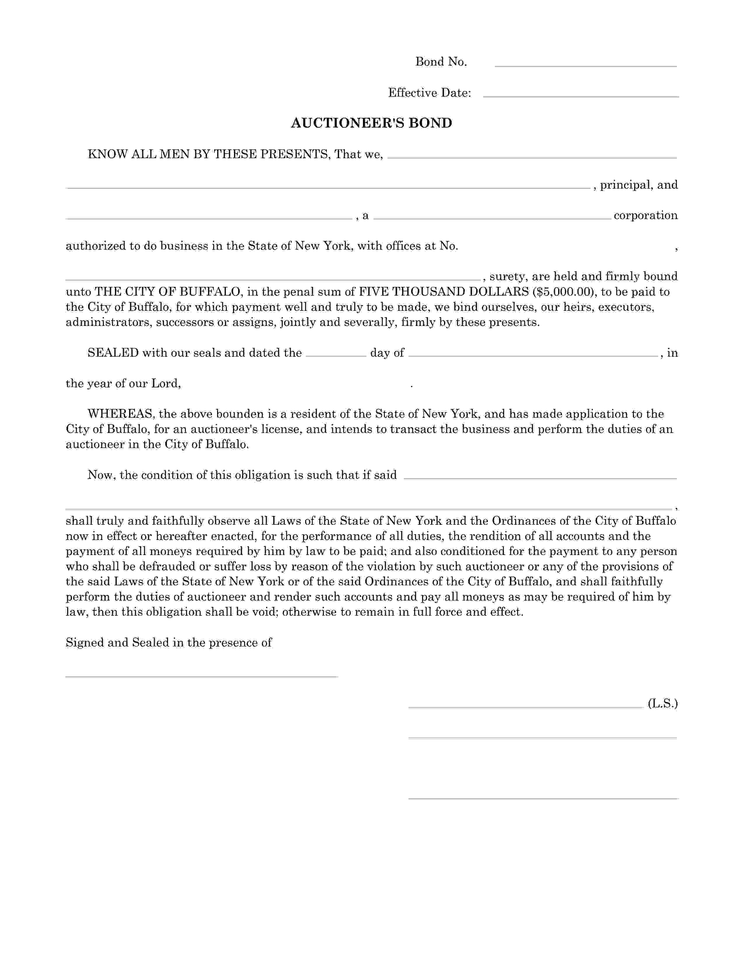 The New York City of Buffalo Auctioneer Bond starts at $100 plus shipping costs and fees. Fill out the form to buy your bond instantly!