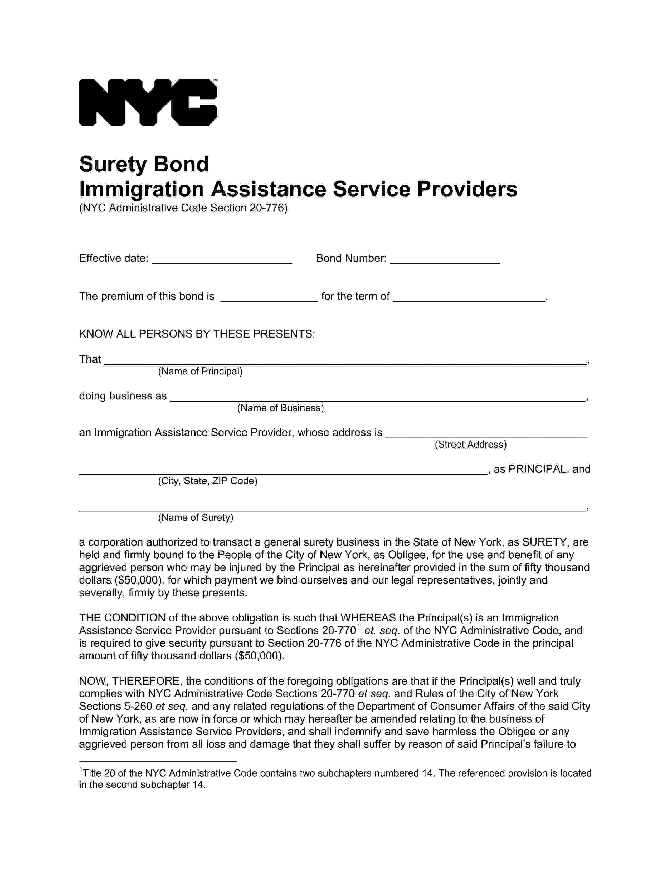 The New York City of New York Immigration Assistance Service Providers Bond starts at $500 plus shipping costs and fees. Fill out the form to buy your bond instantly!