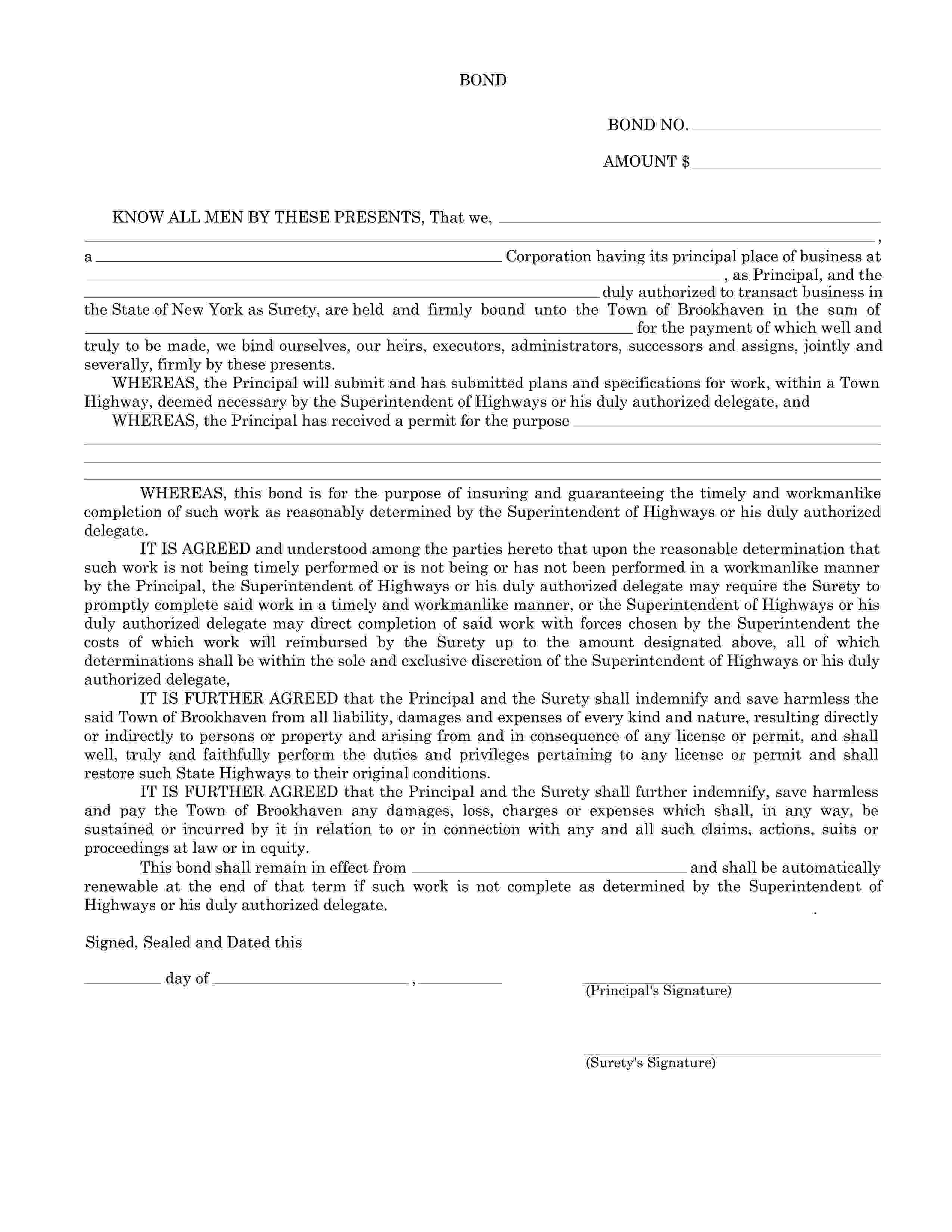 The New York Town of Brookhaven Highway Permit Bond starts at $100 plus shipping costs and fees. Fill out the form to buy your bond instantly!