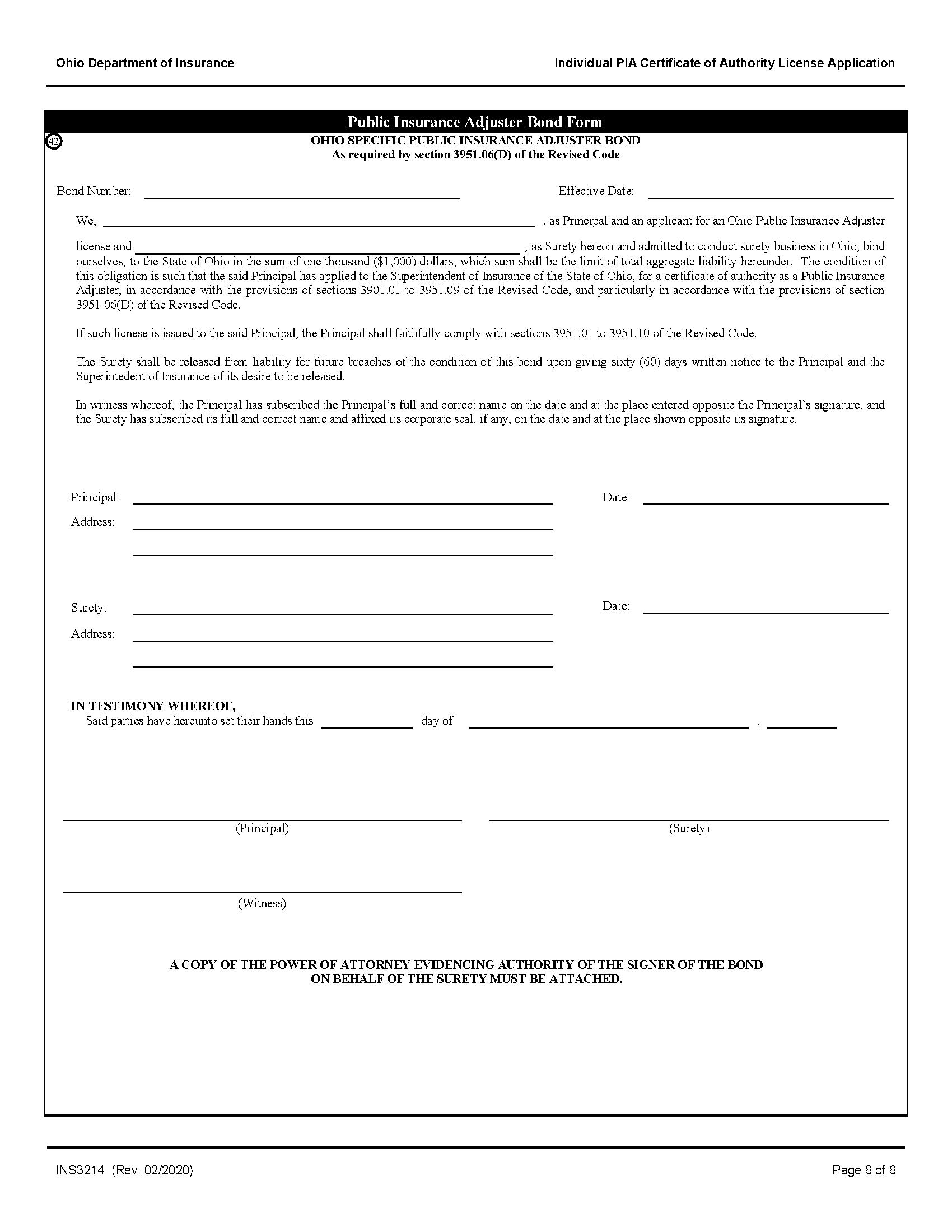 The Ohio Superintendent of Insurance of the State of Ohio Public Insurance Adjuster Bond starts at $65 plus shipping costs and fees. Fill out the form to buy your bond instantly!