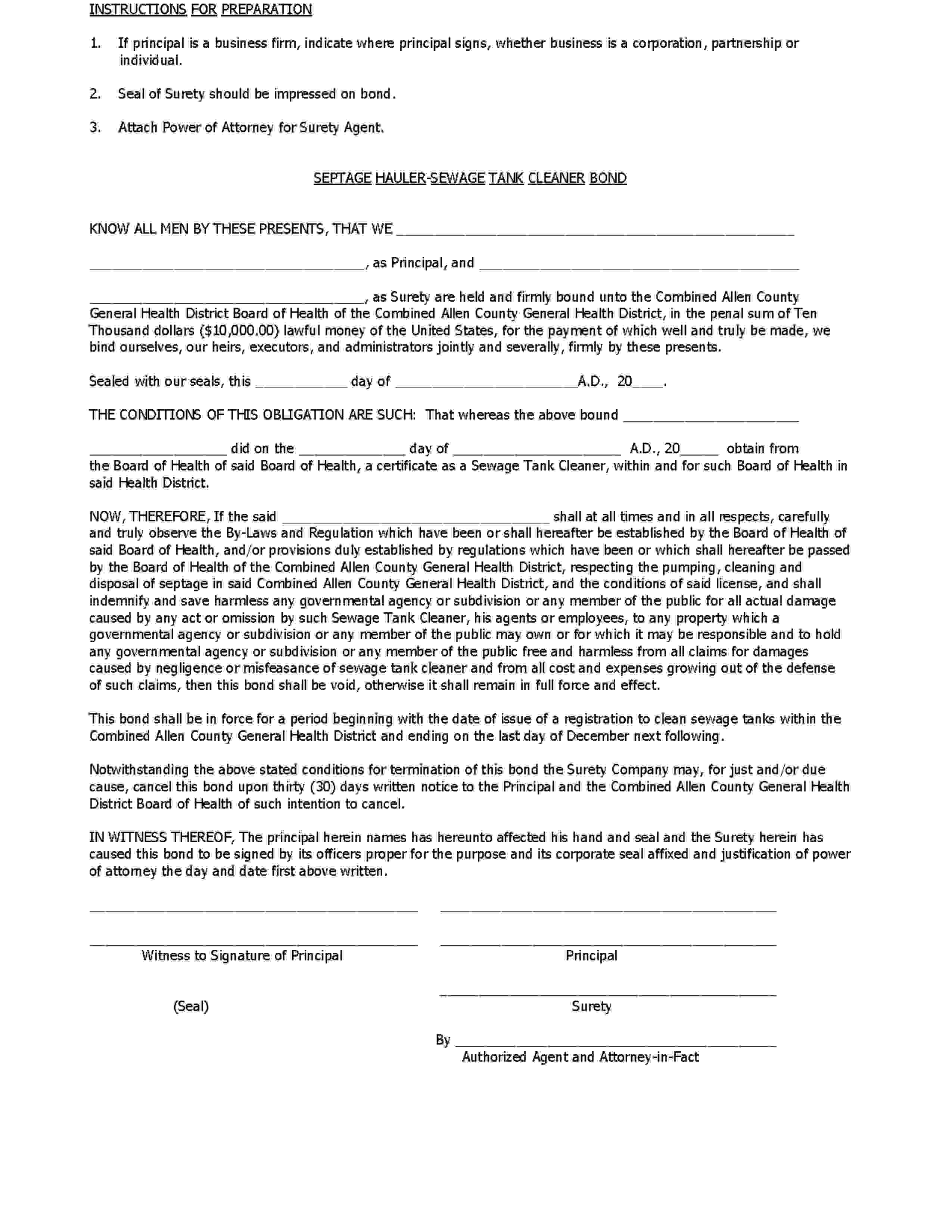 The Ohio Allen - County Septage Hauler-Sewage Tank Cleaner Bond starts at $100 plus shipping costs and fees. Fill out the form to buy your bond instantly!