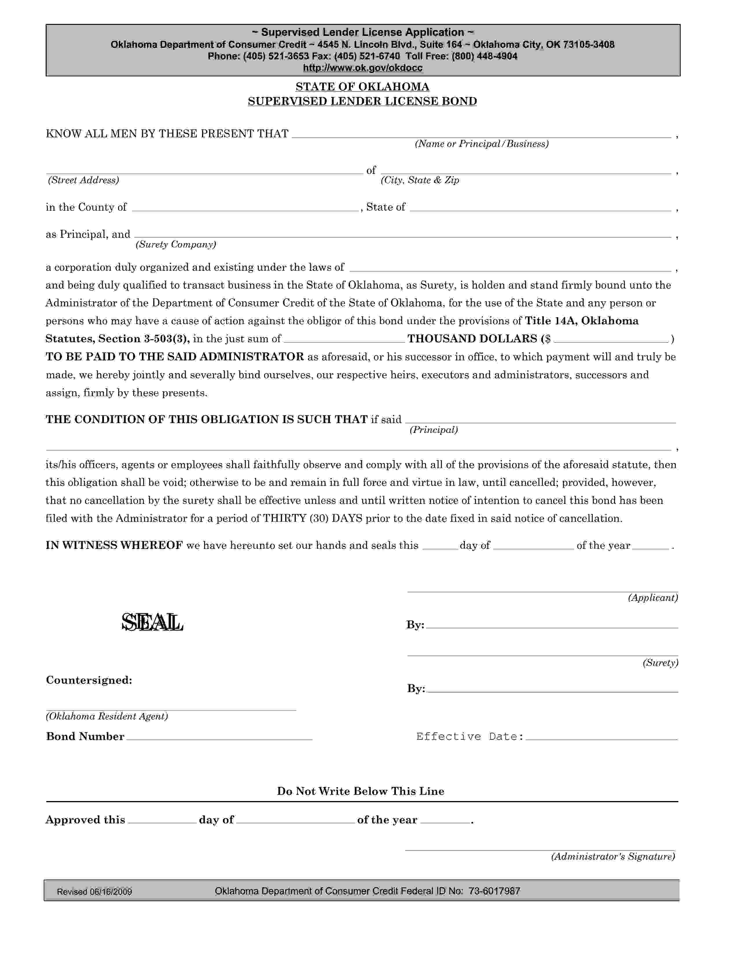 The Oklahoma Supervised Lender License Bond starts at $100 plus shipping costs and fees. Fill out the form to buy your bond instantly!