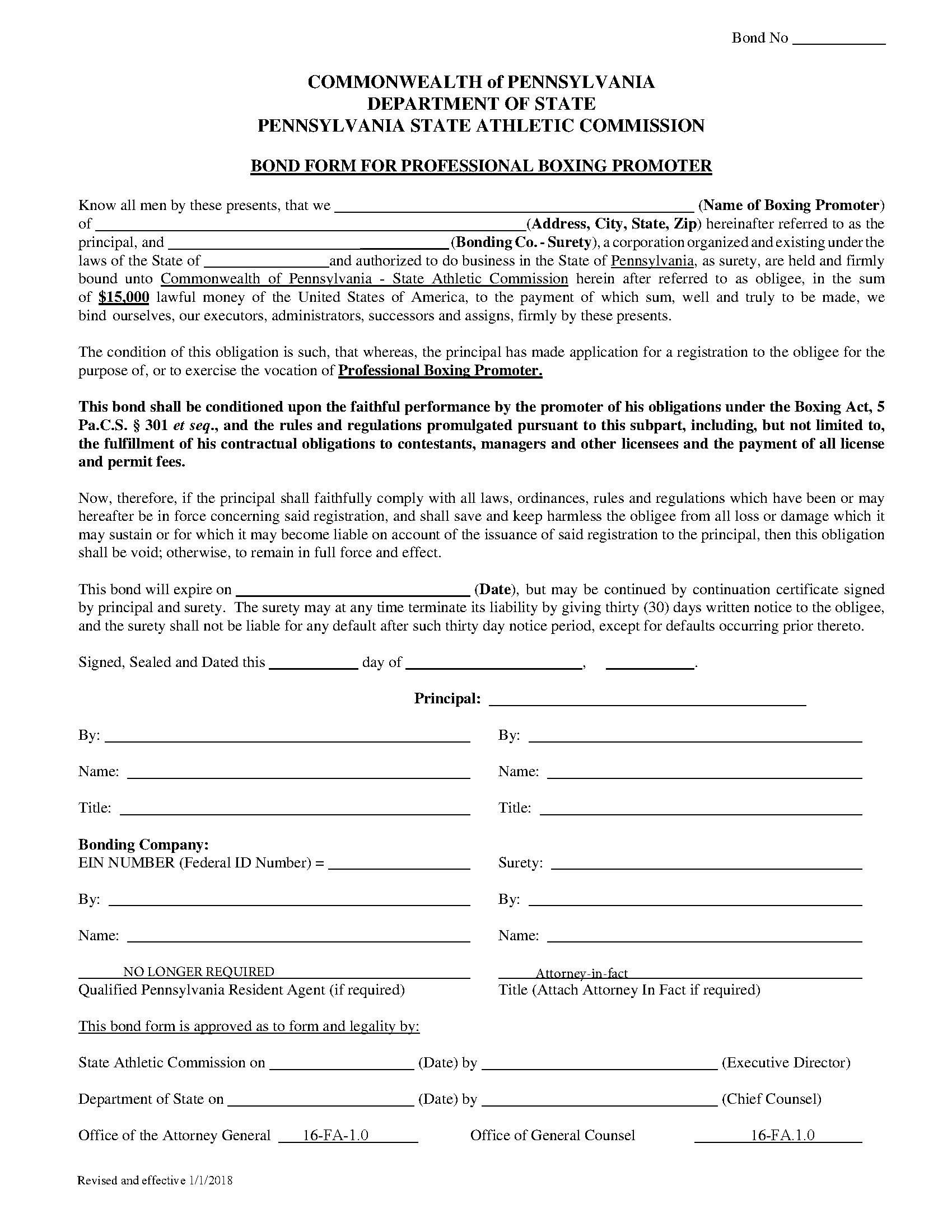 The Pennsylvania Commonwealth of Pennsylvania Professional Boxing Promoter Bond starts at $150 plus shipping costs and fees. Fill out the form to buy your bond instantly!