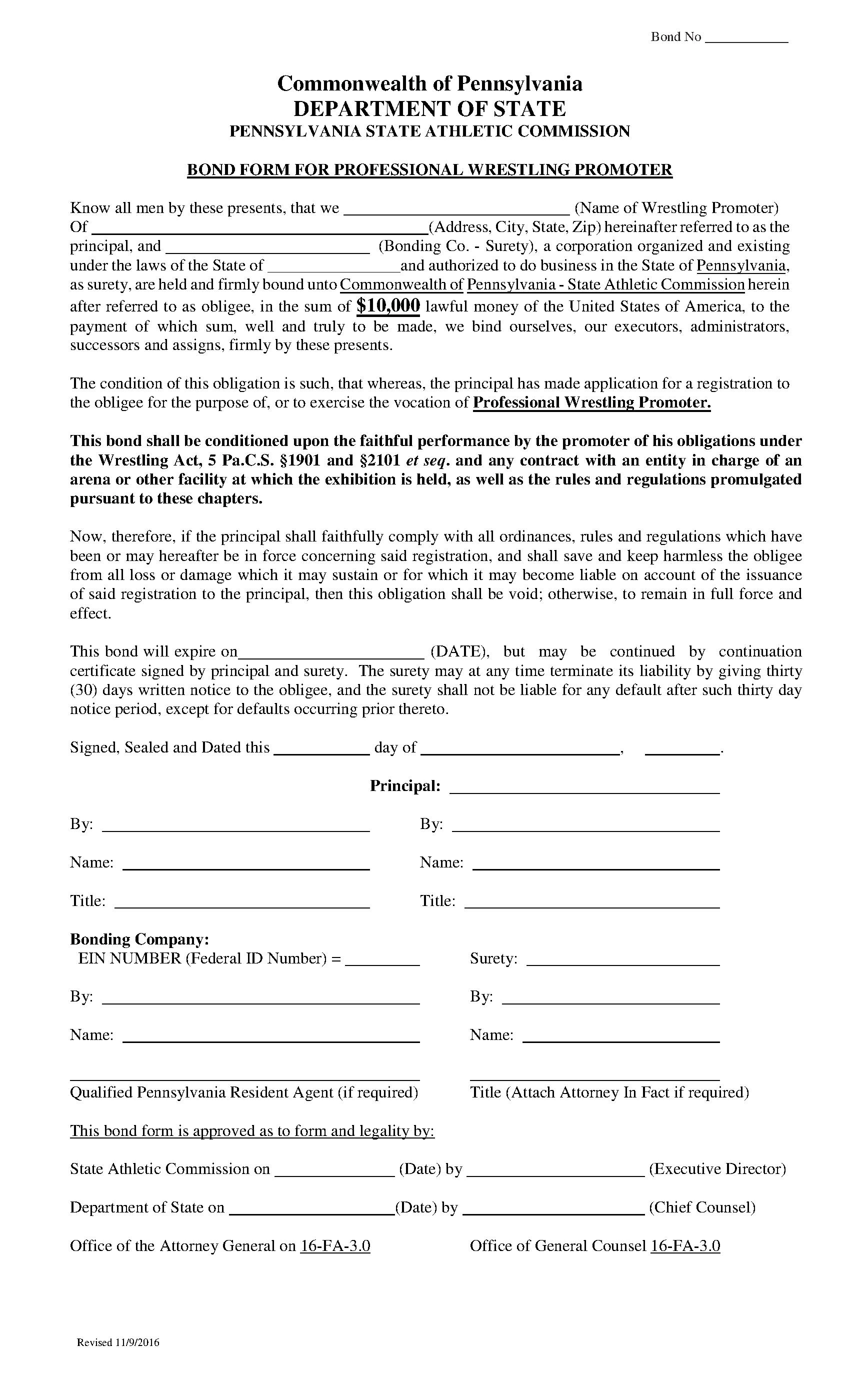 The Pennsylvania Professional Wrestling Promoter Bond starts at $100 plus shipping costs and fees. Fill out the form to buy your bond instantly!