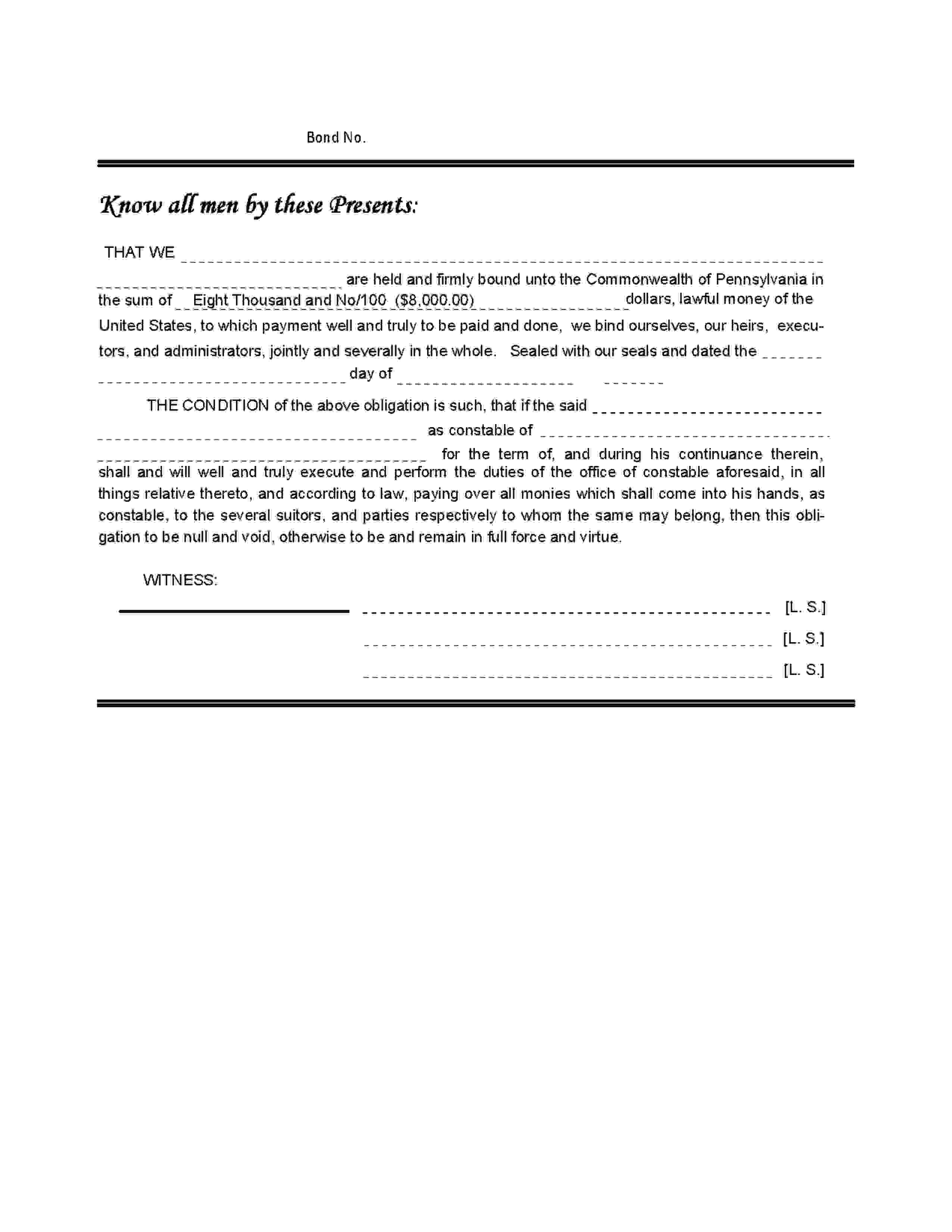 The Pennsylvania Commonwealth of Pennsylvania - Blair County Constable Bond starts at $475 plus shipping costs and fees. Fill out the form to buy your bond instantly!